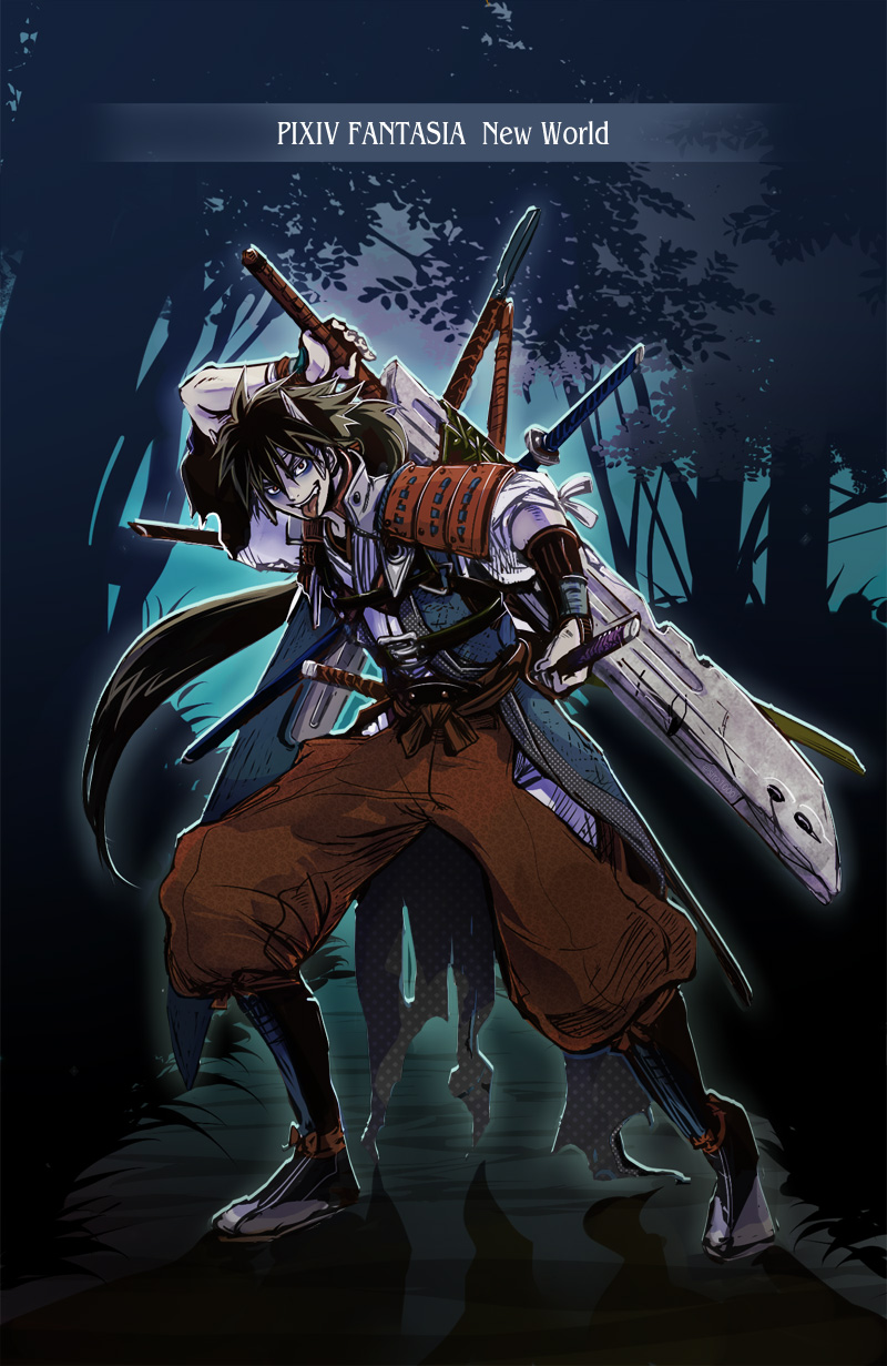 1boy armor black_hair copyright_name dual_wielding full_body highres holding holding_sword holding_weapon japanese_armor long_hair male_focus pixiv_fantasia pixiv_fantasia_new_world red_eyes sheath sheathed shiroton_(kazamineko) shoulder_armor sode solo sword tongue tongue_out very_long_hair weapon
