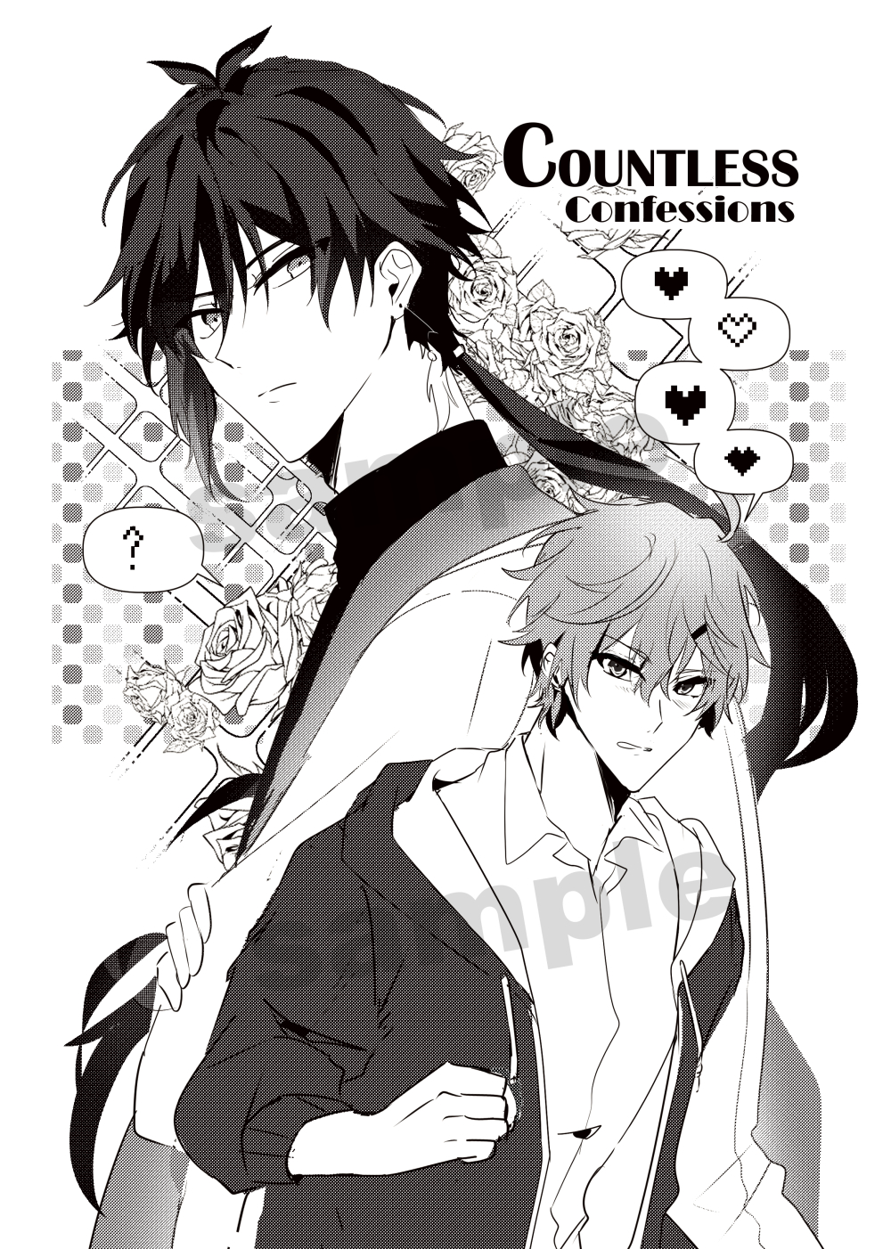 2boys efu_(angelschatedral99) flower genshin_impact greyscale heart highres monochrome multiple_boys ? tartaglia_(genshin_impact) white_background zhongli_(genshin_impact)