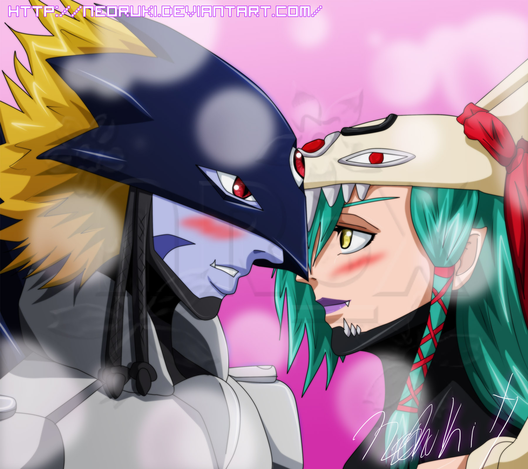 armor beelzebumon_(digimon_xros_wars) blush braid couple digimon digimon_(creature) helmet highres long_hair mask mervamon