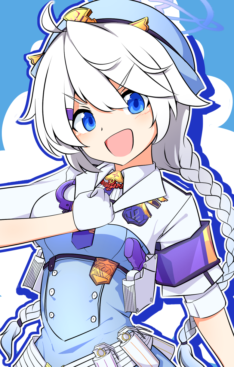 1girl ahoge armband badge blue_archive blue_background blue_eyes braid clenched_hand gloves gun hair_ornament hairclip halo handcuff_dangle hat highres kirino_(blue_archive) kredorf long_hair necktie open_mouth police police_badge police_hat police_uniform purple_halo simple_background smoke_grenade solo swept_bangs twin_braids twintails weapon white_gloves white_hair