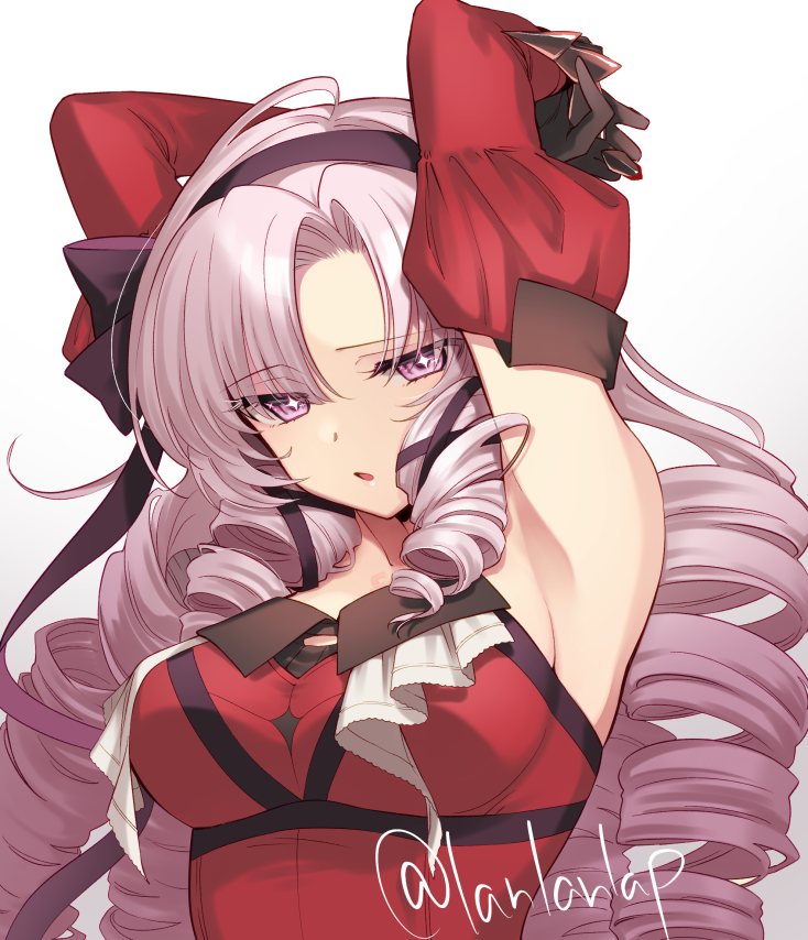 1girl armpits black_gloves breasts chest_tattoo claw_ring detached_sleeves dress drill_hair drill_sidelocks gloves hair_ribbon hairband hyakumantenbara_salome hyakumantenbara_salome_(1st_costume) juliet_sleeves lanlanlap large_breasts light_purple_hair long_hair long_sleeves looking_at_viewer nijisanji open_mouth parted_bangs puffy_sleeves purple_eyes purple_hairband purple_ribbon red_dress red_sleeves ribbon scorpion_tattoo sidelocks simple_background solo sparkling_eyes tattoo twitter_username virtual_youtuber white_background