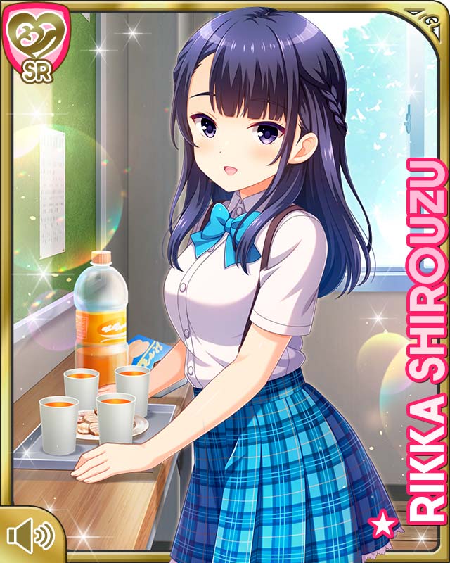 1girl :d black_hair blue_bow blue_skirt bow bowtie braid breasts card_(medium) character_name classroom cup girlfriend_(kari) indoors looking_at_viewer medium_hair official_art open_mouth plaid_clothes plaid_skirt purple_eyes qp:flapper school_uniform shirouzu_rikka shirt shoes skirt small_breasts smile socks solo standing subspenders tagme uneven_bangs white_shirt