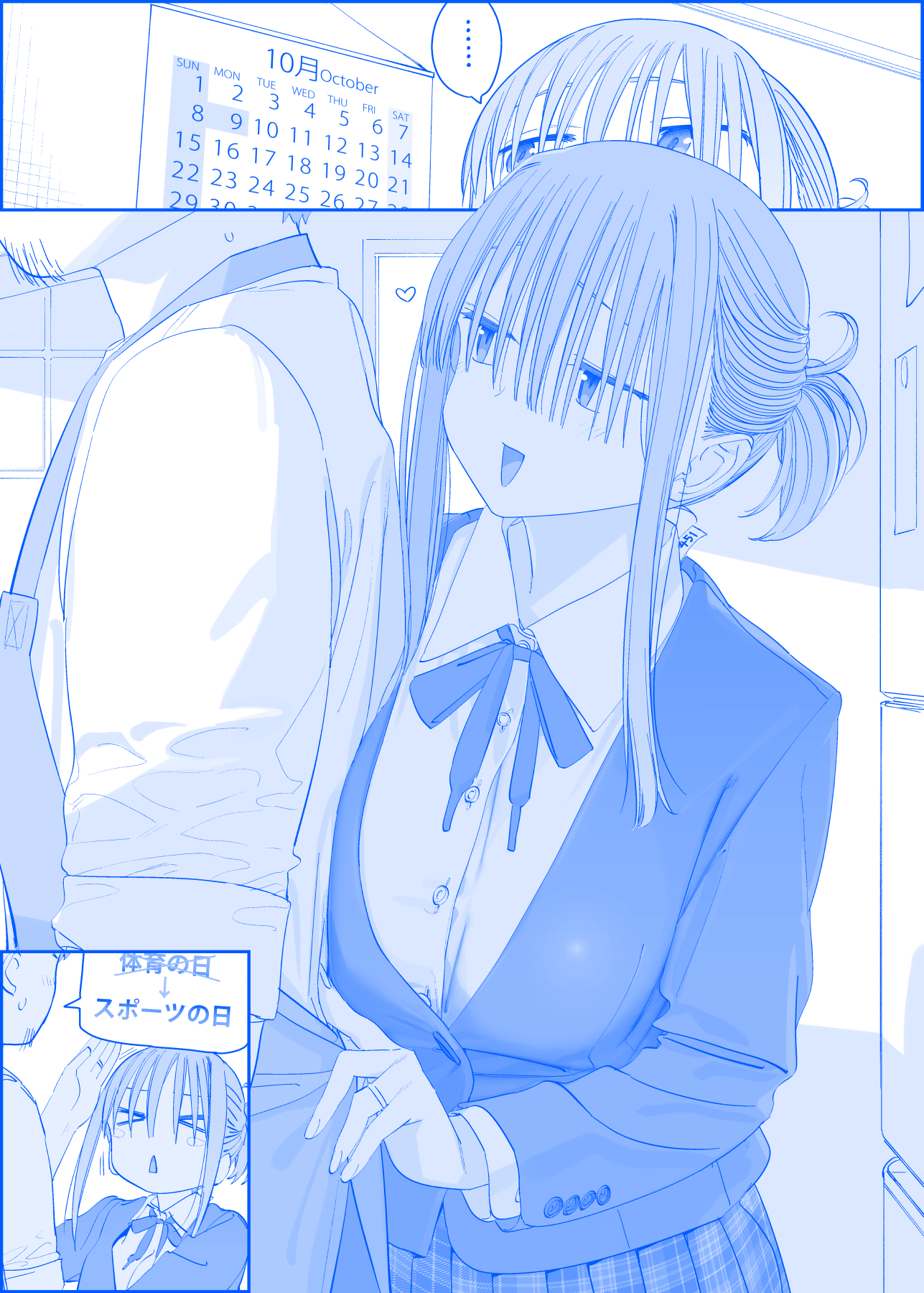 ... 1boy 1girl apron beard_stubble blazer blue_theme blush_stickers breasts calendar_(object) chestnut_mouth chop commentary_request facial_hair getsuyoubi_no_tawawa highres himura_kiseki jacket jewelry large_breasts maegami-chan_(tawawa) pleated_skirt ponytail ring sensei_(tawawa) short_ponytail skirt spoken_ellipsis stubble sweatdrop translation_request wedding_ring