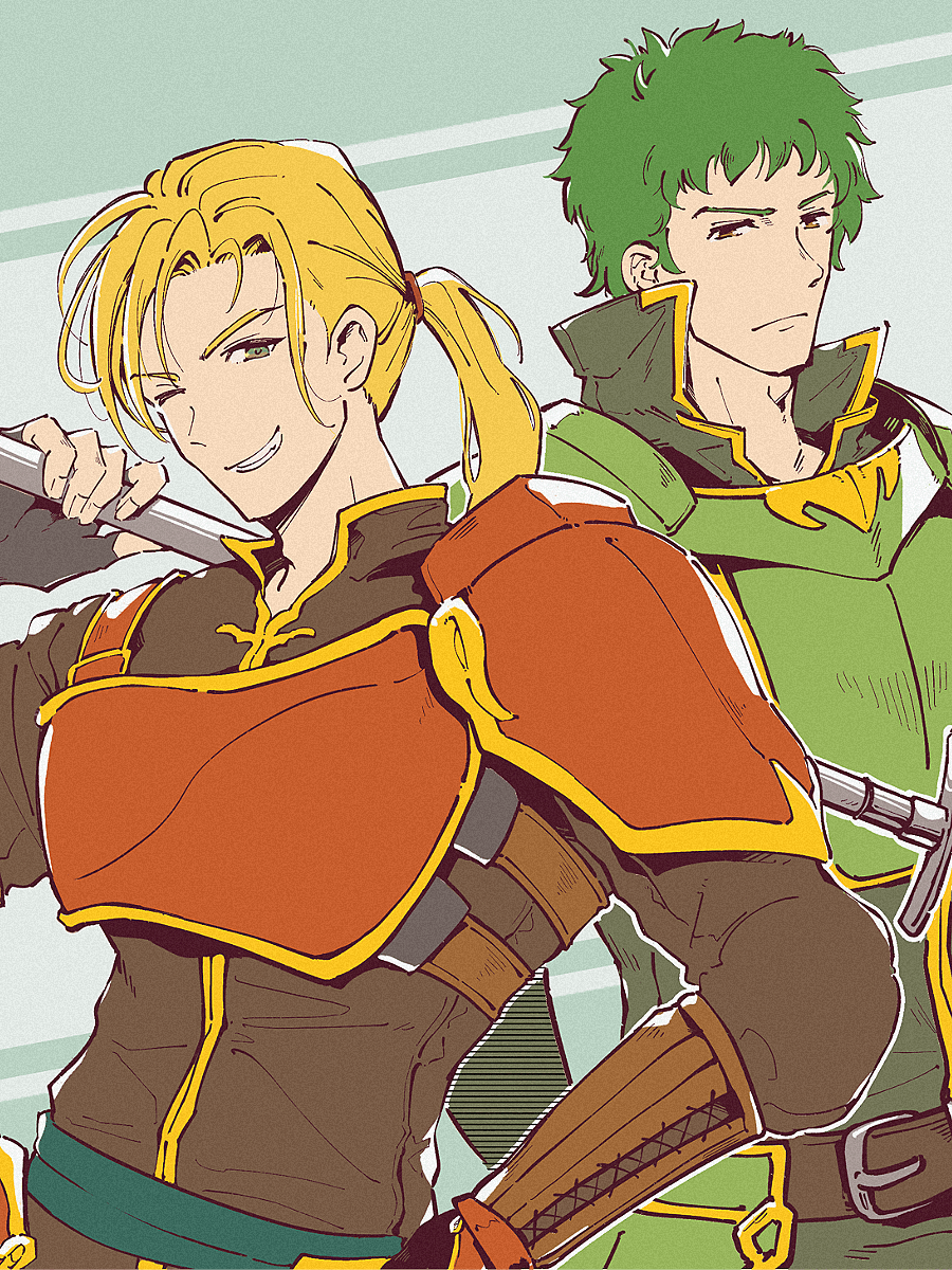 2boys armor blonde_hair eifilet fire_emblem fire_emblem:_the_sacred_stones forde_(fire_emblem) green_eyes green_hair highres holding holding_polearm holding_weapon kyle_(fire_emblem) looking_at_viewer male_focus multiple_boys nintendo polearm ponytail weapon