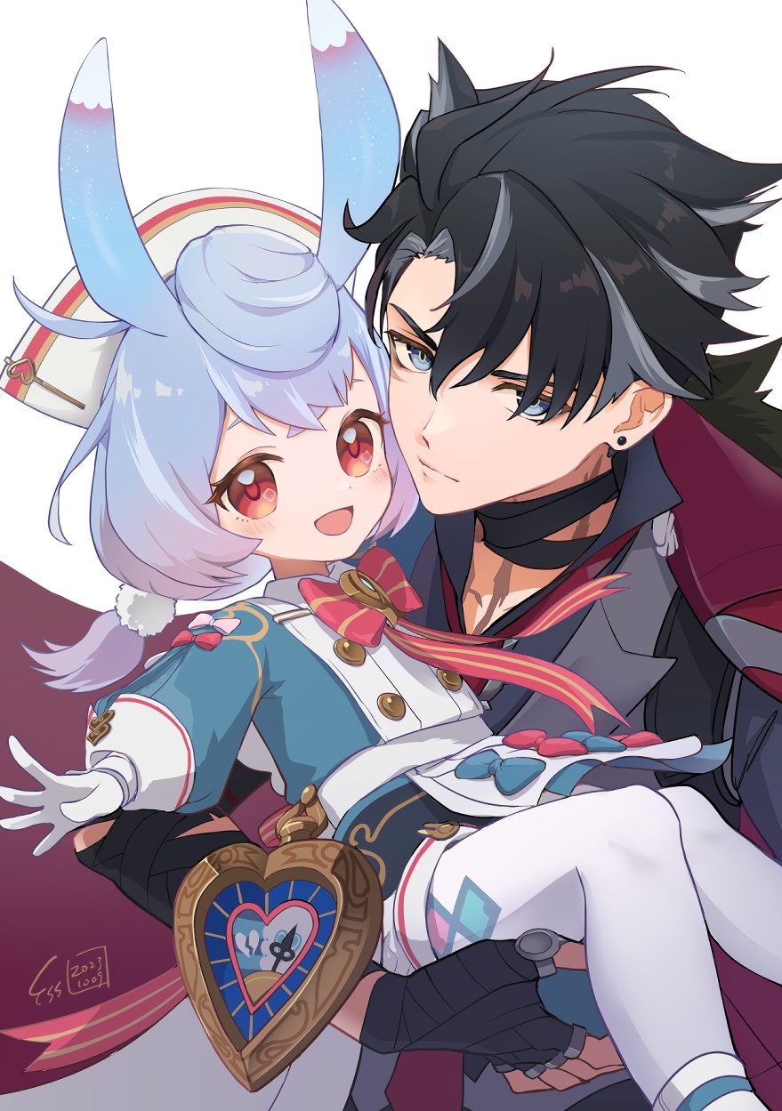 1boy 1girl animal_ears black_gloves black_hair blue_eyes blue_hair ear_piercing fingerless_gloves genshin_impact gloves highres piercing pinocle rabbit_ears rabbit_girl short_hair sigewinne_(genshin_impact) simple_background smile white_background wriothesley_(genshin_impact)