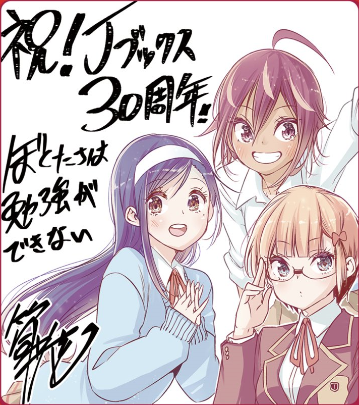 3girls ahoge blue_eyes blue_hair blush bokutachi_wa_benkyou_ga_dekinai brown_hair dark_skin furuhashi_fumino glasses hairband long_hair mole mole_under_eye multiple_girls ogata_rizu open_mouth purple_eyes red_hair school_uniform short_hair takemoto_uruka tan tsutsui_taishi