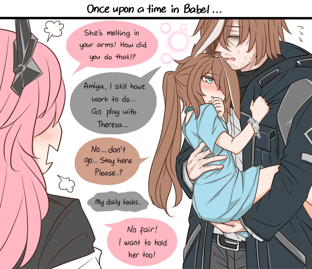 1boy 2girls amiya_(arknights) arknights belt belt_buckle black_belt black_jacket black_shirt blue_dress blue_eyes blush brown_hair buckle closed_eyes commentary doctor_(arknights) dress english_commentary english_text flying_sweatdrops grey_pants guin_guin hair_between_eyes hood hood_down hooded_jacket jacket lifting_person long_hair male_doctor_(arknights) multiple_girls nose_blush open_clothes open_jacket open_mouth pants parted_lips pink_hair ponytail shirt short_sleeves sin_(guin_guin) theresa_(arknights) very_long_hair white_shirt