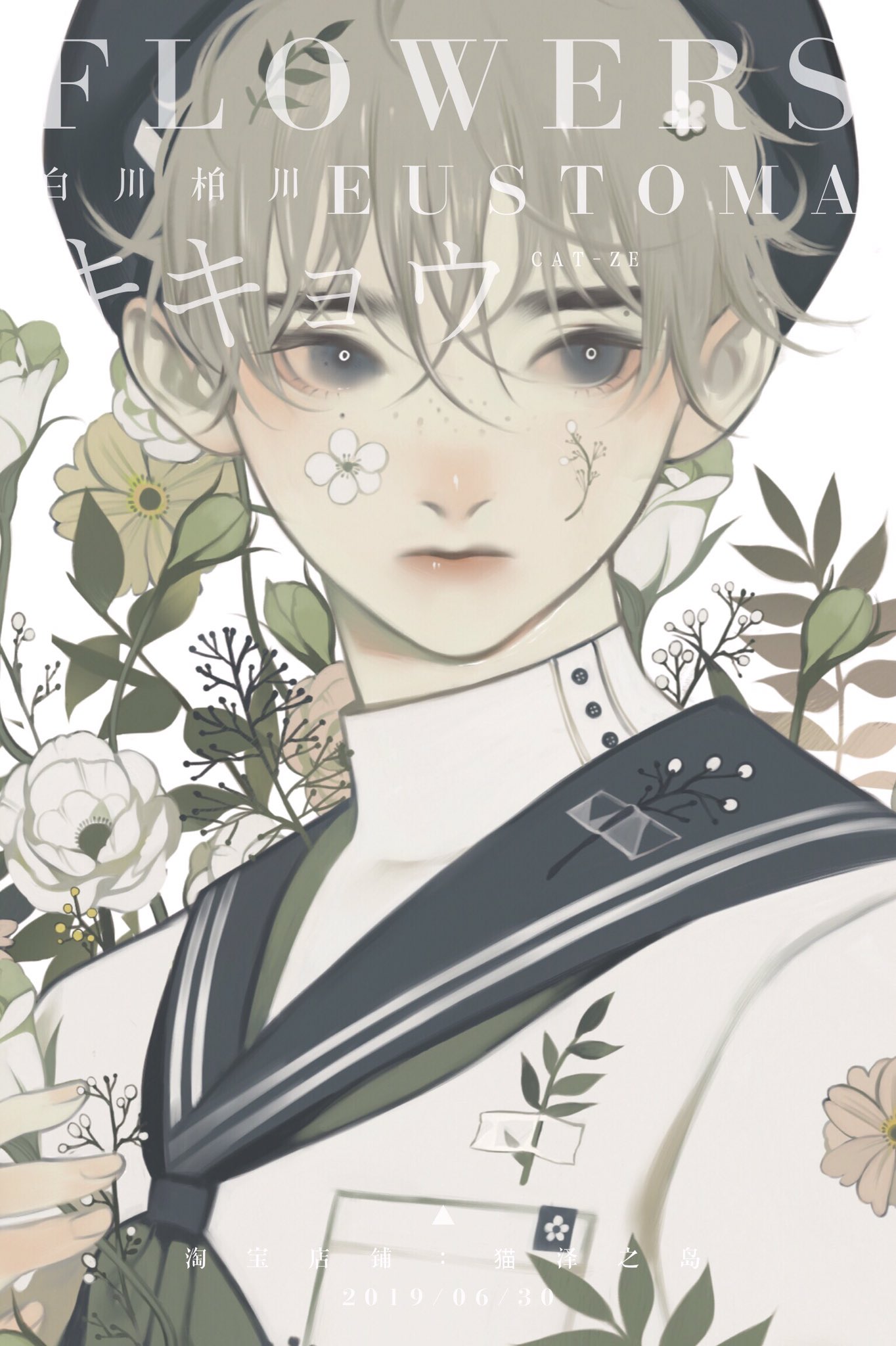 1boy baichuan_baichuan beret black_hat blue_eyes blue_sailor_collar buttons chinese_commentary chinese_text closed_mouth collared_shirt commentary_request dated english_text eustoma expressionless facial_tattoo floral_background flower flower_tattoo freckles green_neckerchief hair_flower hair_ornament hairclip hat high_collar highres leaf light_brown_hair male_focus mixed-language_text neckerchief original plant pocket red_lips sailor_collar shirt short_hair solo straight-on tape tattoo thick_eyebrows translation_request upper_body white_flower white_shirt