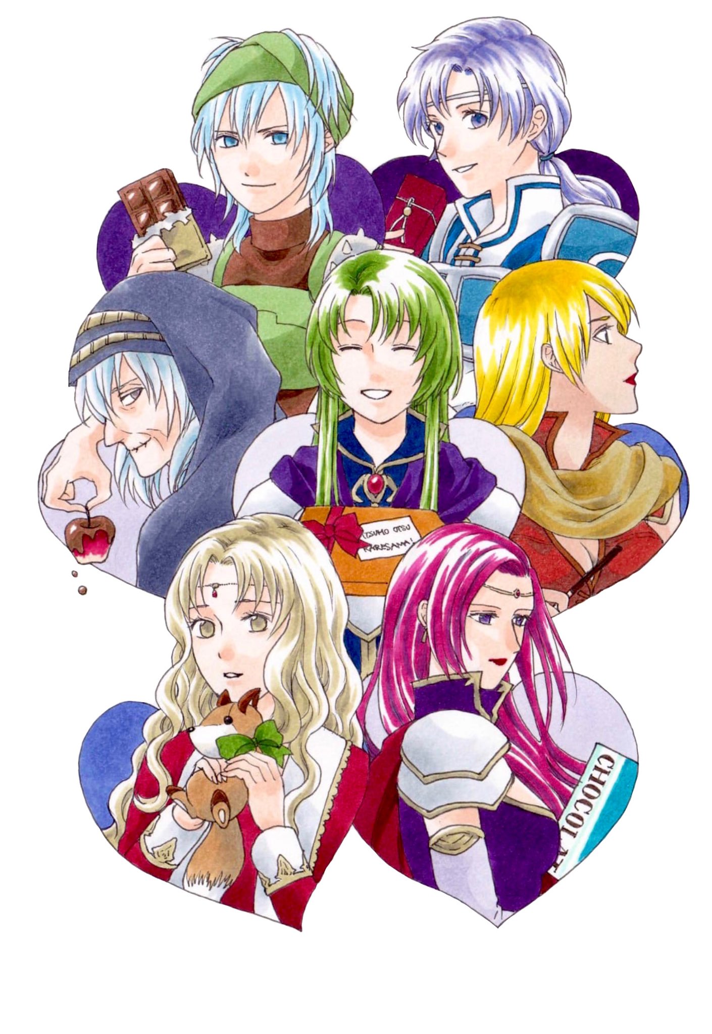 apple blonde_hair breasts brunnya_(fire_emblem) cecilia_(fire_emblem) chocolate echidna_(fire_emblem) fire_emblem fire_emblem:_the_binding_blade food fruit gift green_hair greentapir0415 grey_hair guinevere_(fire_emblem) heart highres igrene_(fire_emblem) juno_(fire_emblem) medium_breasts niime_(fire_emblem) nintendo pink_hair purple_hair stuffed_toy tagme traditional_media