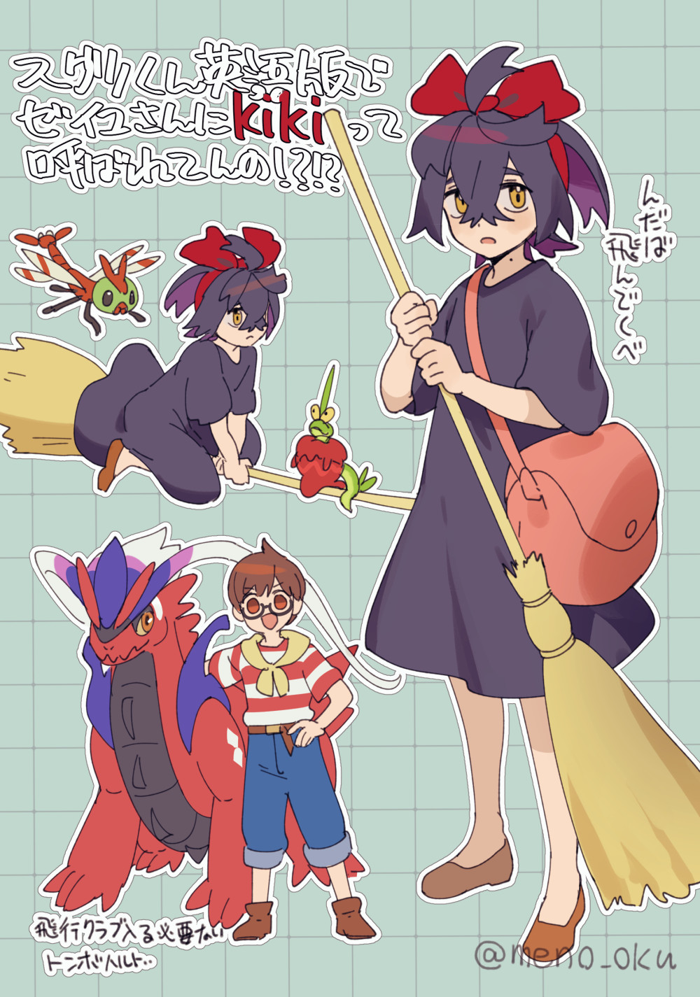 2boys bag black_hair blue_pants broom broom_riding brown_footwear brown_hair commentary_request cosplay crossdressing crossdressing_(mtf) crossed_bangs dipplin dress florian_(pokemon) gen_2_pokemon glasses grid_background hair_between_eyes highres holding kieran_(pokemon) kiki_(majo_no_takkyuubin) kiki_(majo_no_takkyuubin)_(cosplay) koraidon majo_no_takkyuubin male_focus meno_oku multiple_boys name_connection nintendo open_mouth outline pants pokemon pokemon_(creature) pokemon_scarlet_and_violet shirt shoes short_hair shoulder_bag standing striped_clothes striped_shirt tombo_(majo_no_takkyuubin) tombo_(majo_no_takkyuubin)_(cosplay) translation_request yanma