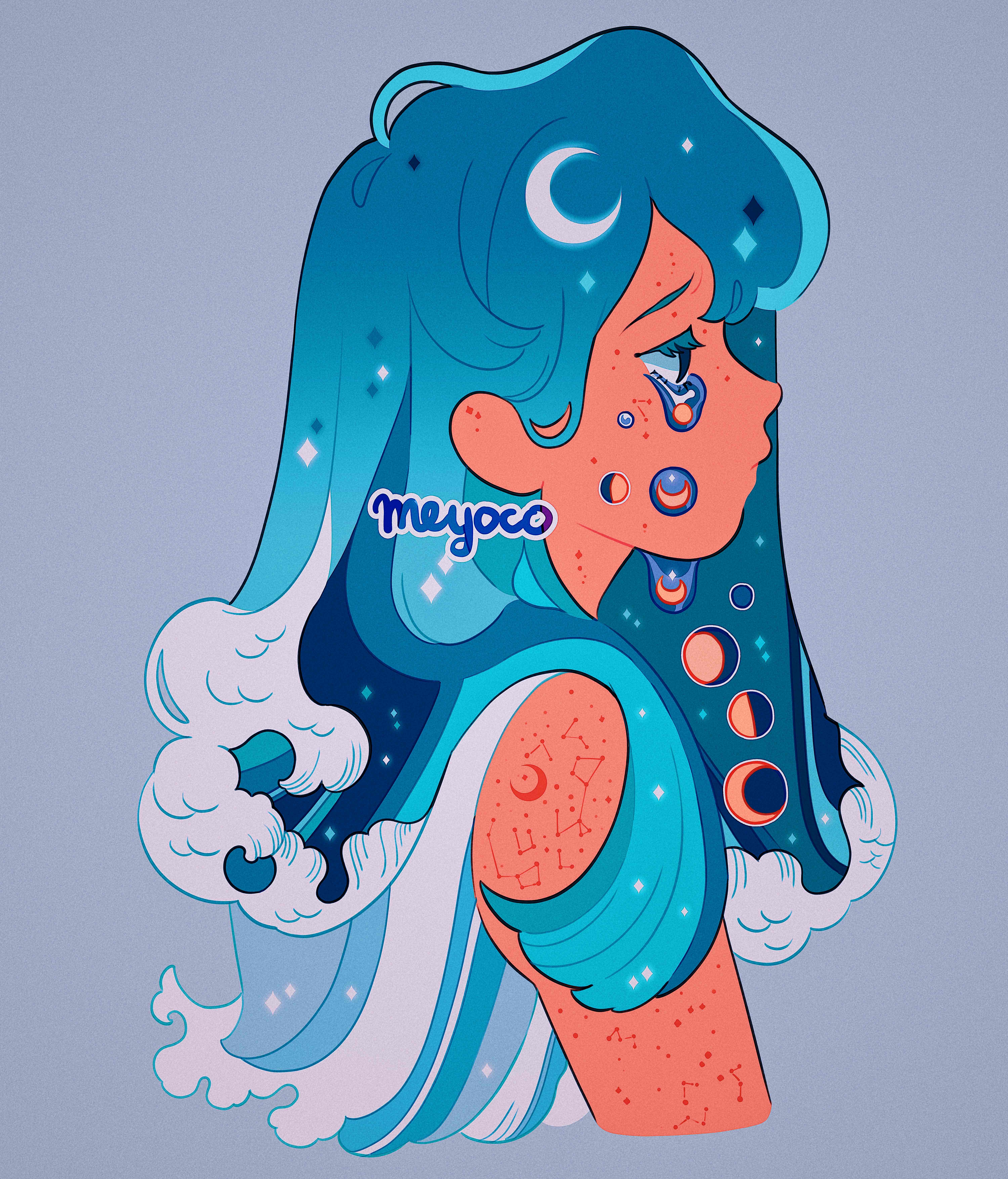 1girl absurdres artist_name blue_hair constellation crescent_moon cropped_torso crying crying_with_eyes_open full_moon gibbous_moon grey_background half_moon highres liquid liquid_hair long_hair meyoco moon moon_phases original profile shaped_liquid simple_background solo sparkle star_(sky) tears upper_body