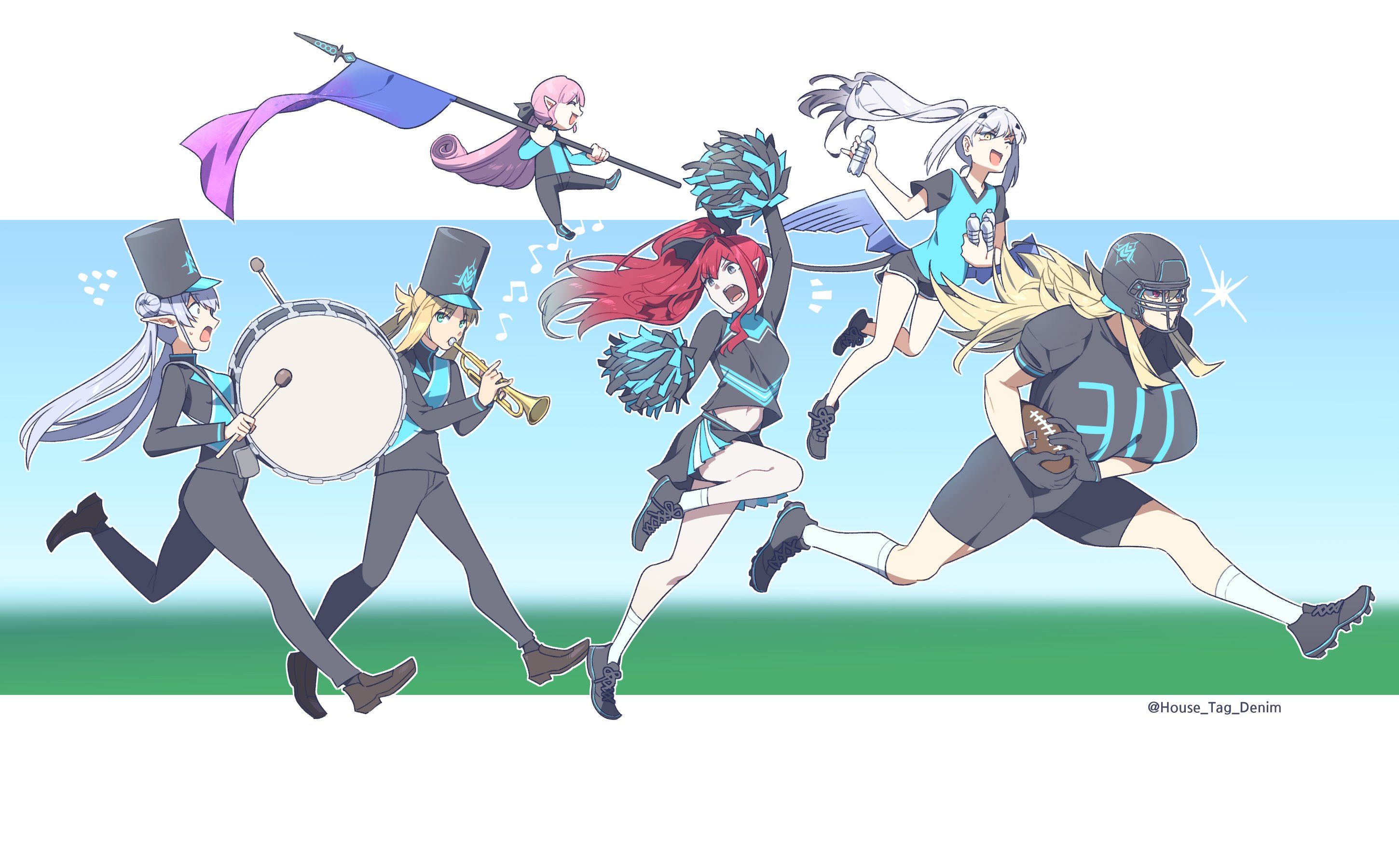 american_football american_football_(object) american_football_uniform artoria_caster_(fate) artoria_pendragon_(fate) ball band_uniform baobhan_sith_(fate) barghest_(fate) biceps blonde_hair blue_eyes bottle breasts britomart_(fate) cheering cheerleader closed_eyes dragon_wings drum fate/grand_order fate_(series) flag flagpole floating flying forked_eyebrows green_eyes grey_eyes grey_hair habetrot_(fate) hair_bun hat highres holding holding_ball holding_flag holding_instrument holding_pole holding_pom_poms house_tag_denim huge_breasts instrument large_breasts long_hair looking_at_viewer marching_band melusine_(fate) midriff miniskirt multiple_girls muscular muscular_female music open_mouth pink_hair playing_instrument pointy_ears pole pom_pom_(cheerleading) pom_poms ponytail red_eyes rugby_ball sidelocks skirt small_breasts smile sportswear standard_bearer star_(symbol) star_sticker sticker tall_female thighs trumpet very_long_hair water_bottle white_hair wings yellow_eyes