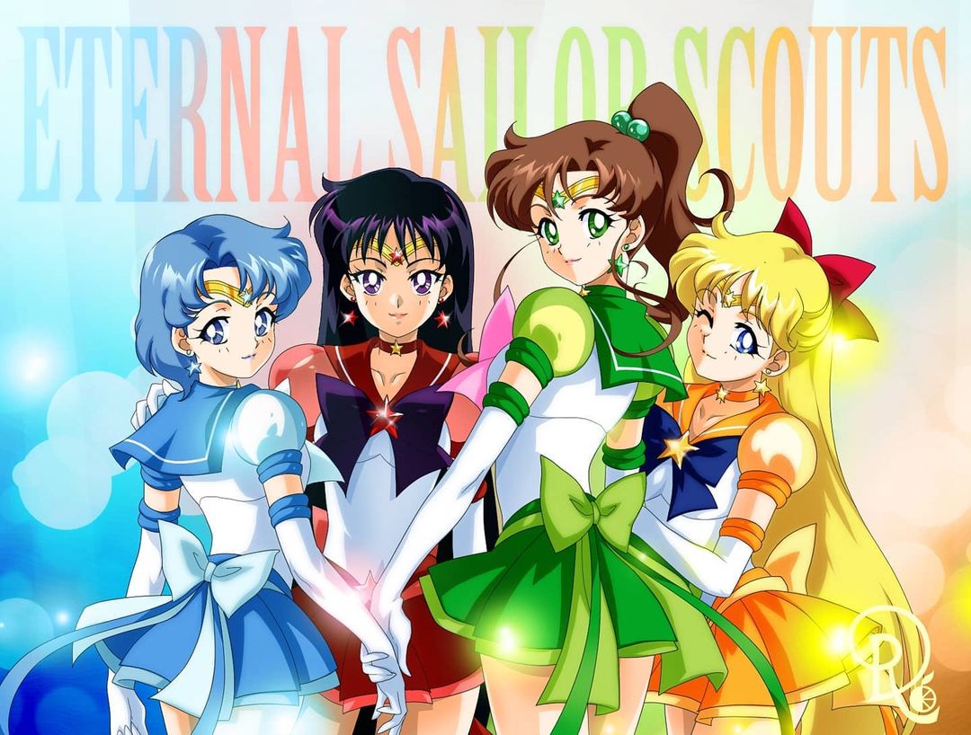 4girls aino_minako arms_at_sides asymmetrical_bangs back_bow bare_legs bishoujo_senshi_sailor_moon black_hair blonde_hair blue_bow blue_eyes blue_hair blue_sailor_collar blue_skirt bow brown_hair choker closed_mouth collarbone drachea_rannak earrings elbow_gloves english_text from_behind gloves goggles green_bow green_choker green_eyes green_sailor_collar green_skirt hair_bobbles hair_bow hair_ornament hand_on_another's_shoulder harp head_tilt high_ponytail hino_rei holding_hands instrument jewelry kino_makoto long_hair looking_at_viewer looking_back magical_girl miniskirt mizuno_ami multiple_girls neck necklace one_eye_closed orange_bow orange_choker orange_sailor_collar orange_skirt pink_bow pink_lips pleated_skirt ponytail puffy_short_sleeves puffy_sleeves purple_bow purple_eyes purple_hair red_bow red_choker red_sailor_collar red_skirt sailor_collar sailor_jupiter sailor_mars sailor_mercury sailor_senshi_uniform sailor_venus short_hair short_sleeves skirt smile standing star_(symbol) star_choker star_earrings star_necklace straight_hair super_sailor_jupiter_(stars) super_sailor_mars_(stars) super_sailor_mercury_(stars) super_sailor_venus_(stars) tiara very_long_hair white_gloves wink