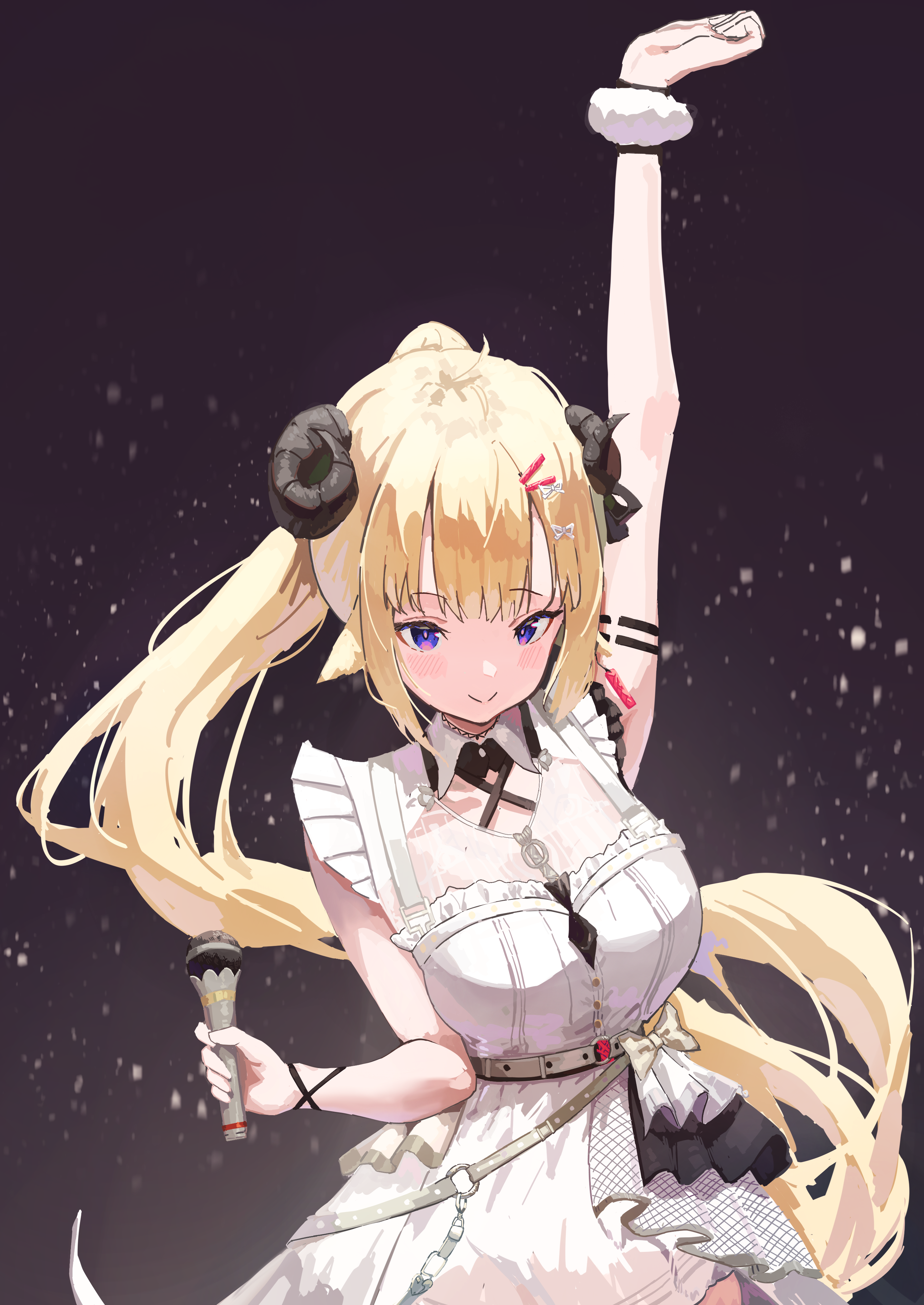 1girl absurdres animal_ears arm_up belt bizarre_(bizarre64637036) blonde_hair blush collar detached_collar dress hair_ornament hairpin highres holding holding_microphone hololive horns long_hair looking_at_viewer microphone official_alternate_costume ponytail purple_eyes sheep_ears sheep_girl sheep_horns smile solo tsunomaki_watame tsunomaki_watame_(watame_night_fever!!) virtual_youtuber white_belt white_collar white_dress