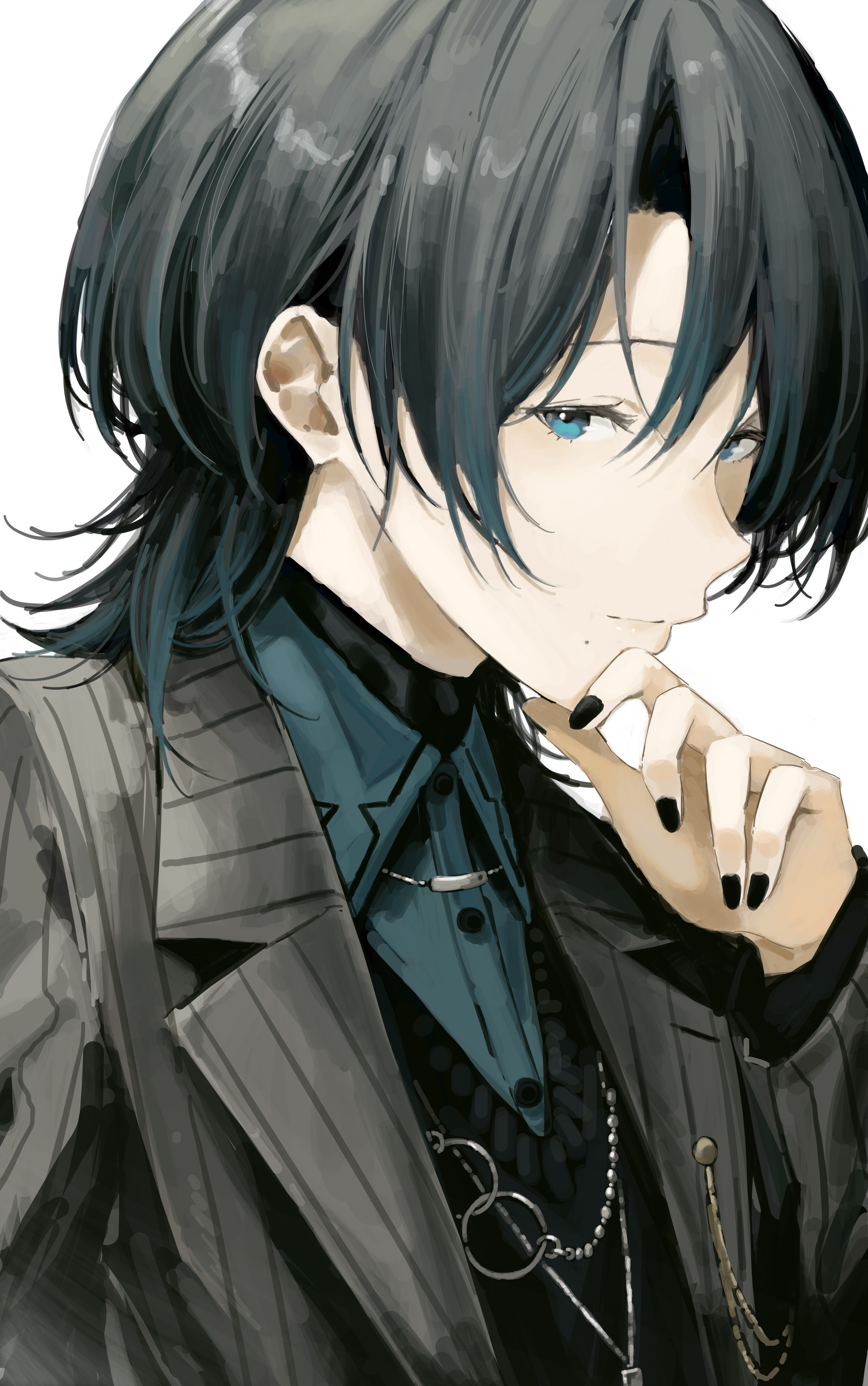 1girl absurdres black_cardigan black_hair black_nails blue_eyes blue_shirt cardigan closed_mouth collared_shirt formal_clothes grey_jacket hand_on_own_chin highres hiodoshi_ao hiodoshi_ao_(1st_costume) hololive hololive_dev_is jacket kyoko_(toran0k0) looking_at_viewer looking_to_the_side medium_hair nail_polish profile shirt simple_background solo striped_clothes striped_jacket stroking_own_chin suit upper_body vertical-striped_clothes vertical-striped_jacket virtual_youtuber white_background