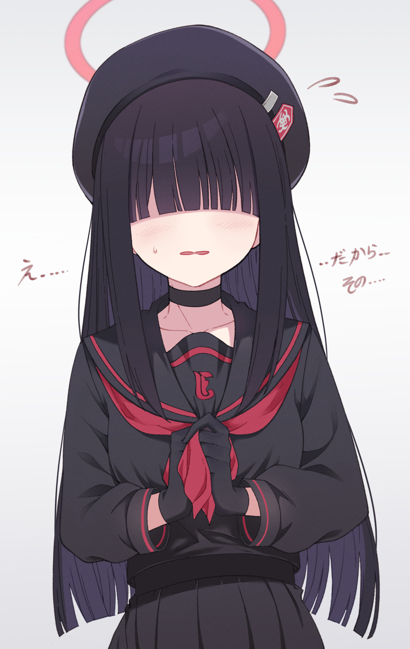 1girl anavi beret black_choker black_gloves black_hair black_hat black_sailor_collar black_serafuku blue_archive blunt_bangs blush choker commentary_request gloves hair_over_eyes halo hat highres justice_task_force_member_(blue_archive) long_hair long_sleeves neckerchief pleated_skirt red_neckerchief sailor_collar school_uniform serafuku simple_background skirt solo sweatdrop translation_request white_background