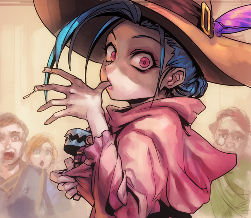 2boys 2girls alternate_costume alternate_hairstyle braid braided_bun brown_headwear cream_on_hands explosive food from_side grenade hair_bun hat_feather holding hood hood_down hoodie jinx_(league_of_legends) league_of_legends long_hair looking_at_viewer multiple_boys multiple_girls phantom_cross pink_eyes pink_hoodie solo_focus thumb_to_mouth upper_body