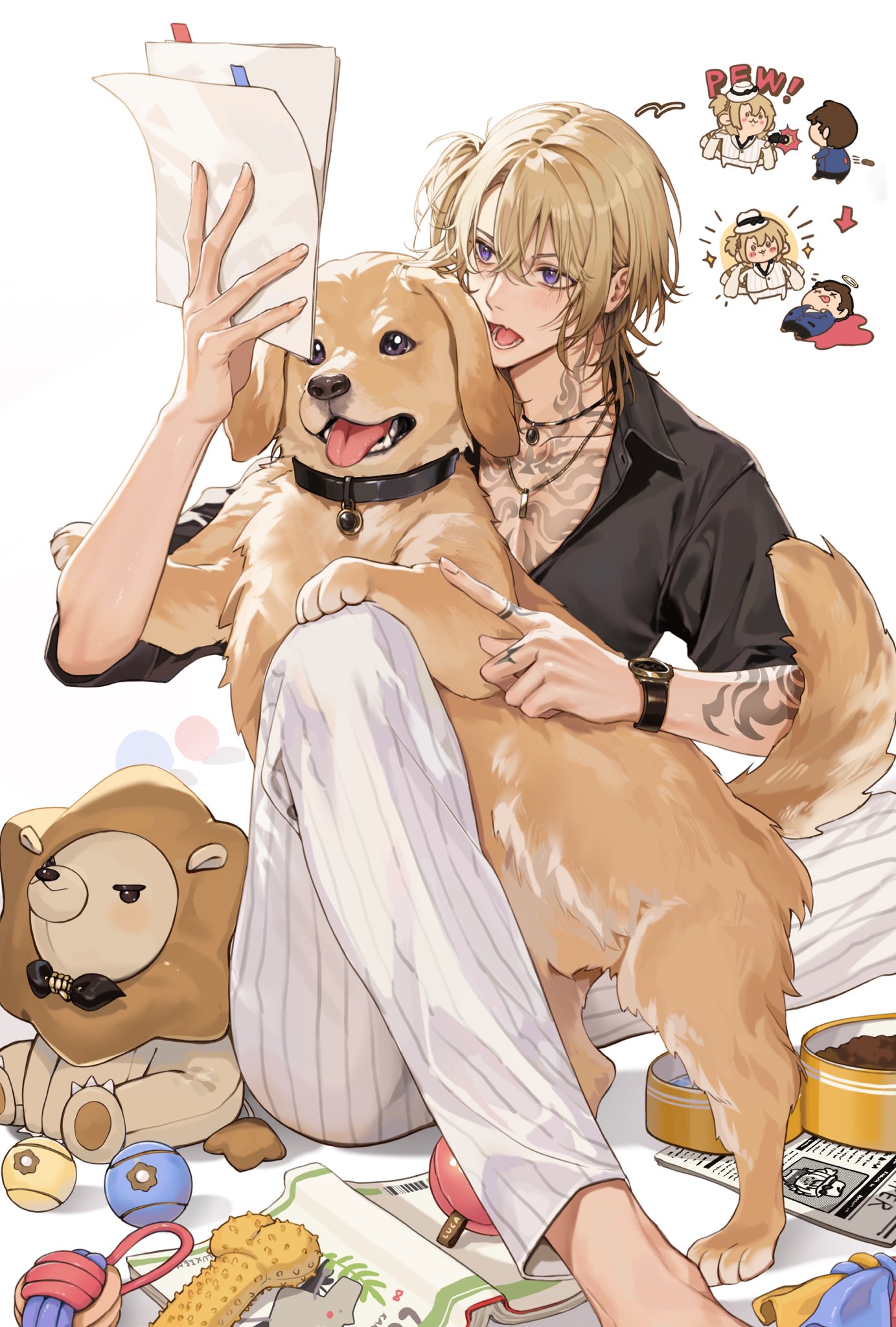 1boy arm_tattoo augustus_(luca_kaneshiro) barefoot black_shirt blonde_hair chest_tattoo collared_shirt commentary dog finger_tattoo golden_retriever highres holding holding_paper jewelry luca_kaneshiro luca_kaneshiro_(1st_costume) male_focus necklace nijisanji nijisanji_en open_mouth pants papa_(you_have_today) paper purple_eyes shirt short_side_ponytail side_ponytail solo stuffed_animal stuffed_lion stuffed_toy tattoo untranslatable_commentary virtual_youtuber watch white_pants wristwatch