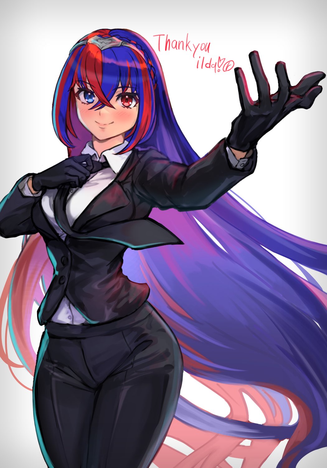 1girl female_alear_(fire_emblem) alternate_costume black_necktie black_suit blue_eyes blue_hair blush braid business_suit contemporary crossed_bangs crown_braid fire_emblem fire_emblem_engage formal_clothes gloves heterochromia highres long_hair looking_at_viewer multicolored_hair necktie nintendo r123 red_eyes red_hair smile solo split-color_hair suit tiara two-tone_hair very_long_hair
