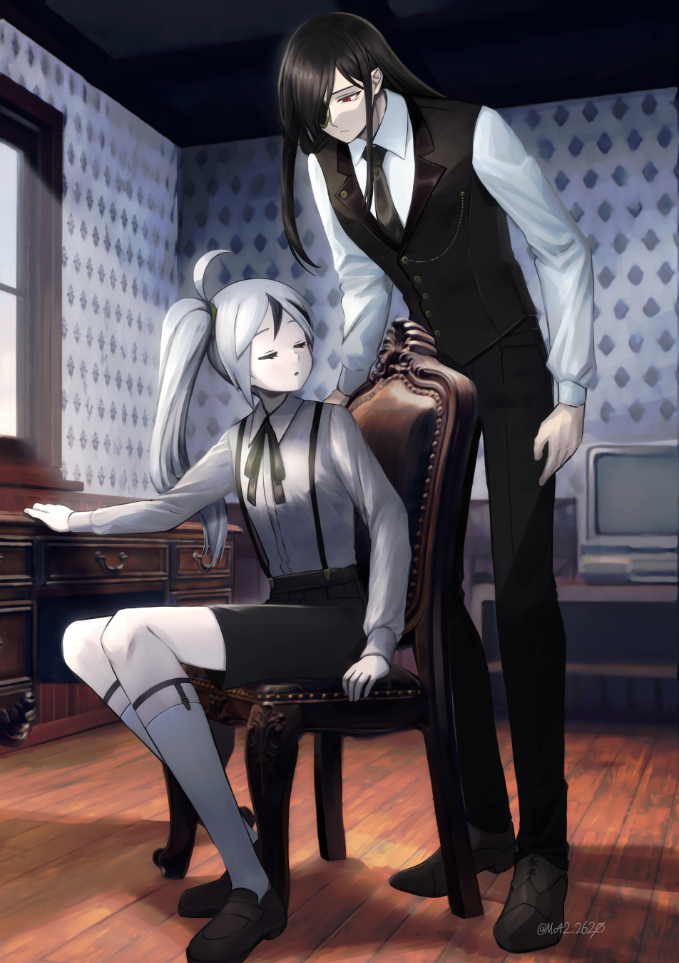 2boys ahoge aiguillette black_hair black_necktie black_pants black_ribbon black_shorts black_vest brown_footwear buttons closed_eyes collared_shirt desk esther_(project_moon) eyepatch highres indoors leaning_forward legwear_garter library_of_ruina loafers long_hair long_sleeves moribe_denkou multicolored_hair multiple_boys neck_ribbon necktie pants parted_lips project_moon red_eyes ribbon shirt shoes shorts side_ponytail sitting socks standing streaked_hair very_long_hair vest white_hair white_shirt white_socks window wooden_floor yan_vismok