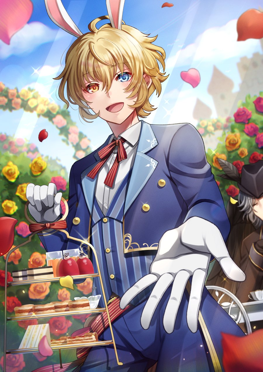 2boys :d alice's_adventures_in_wonderland animal_ears arch beckoning bicorne black_headwear black_jacket blonde_hair blue_coat blue_eyes blue_pants blue_vest bungou_to_alchemist bush buttons cake castle chair closed_eyes cloud coat collared_shirt conan_doyle_(bungou_to_alchemist) cosplay cowboy_shot cowlick day dessert falling_petals floral_arch flower food gloves grey_hair hair_between_eyes hat hat_feather heterochromia highres holding holding_tiered_tray jacket lapels lewis_carroll_(bungou_to_alchemist) light_particles light_rays long_sleeves male_focus multiple_boys neck_ribbon notched_lapels open_mouth pants petals pink_flower pink_rose rabbit_ears red_flower red_ribbon red_rose red_sash ribbon rose rose_bush sandwich sash scone shirt short_hair smile solo_focus sparkle standing striped_clothes striped_ribbon striped_vest table tailcoat tiered_tray tukisaya vertical-striped_clothes vertical-striped_vest vest white_gloves white_rabbit_(alice_in_wonderland) white_rabbit_(alice_in_wonderland)_(cosplay) white_shirt yellow_eyes yellow_flower yellow_rose
