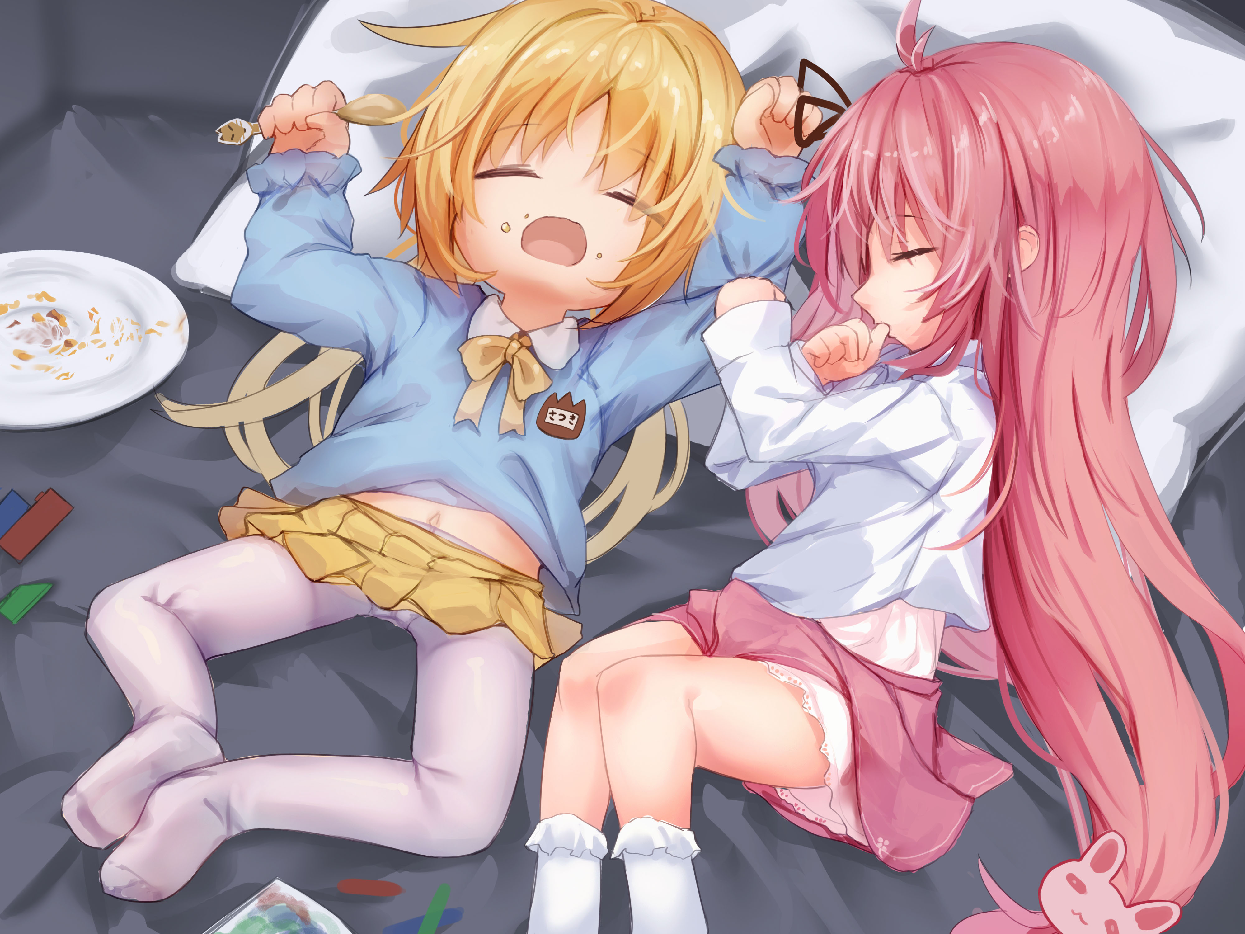 2girls absurdres aged_down blonde_hair finger_in_own_mouth highres holding holding_spoon kantai_collection kindergarten_uniform lego_brick logiclr long_hair multiple_girls navel pantyhose pillow pink_hair plate satsuki_(kancolle) sleeping spoon twintails uzuki_(kancolle) white_pantyhose