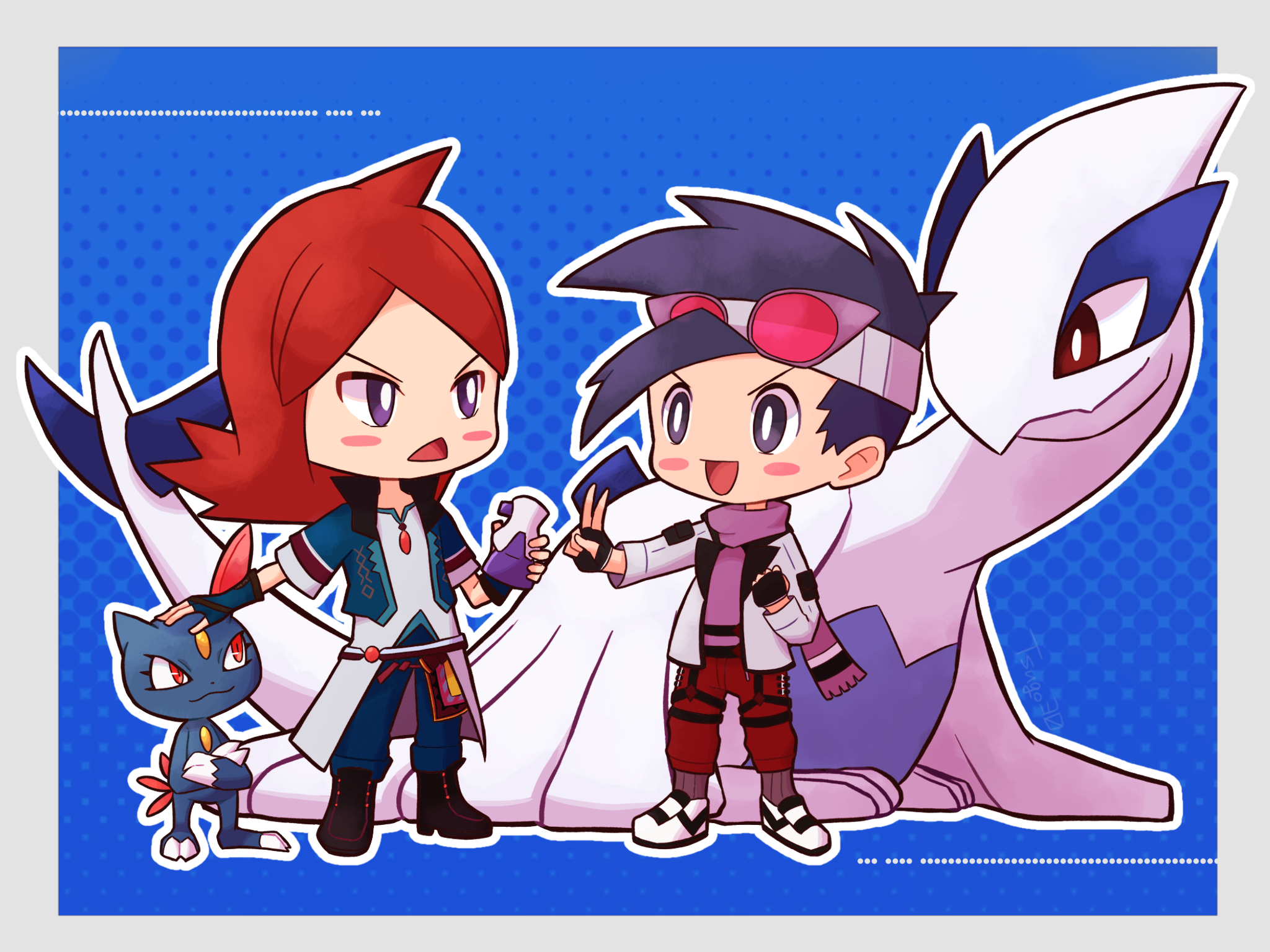 2boys alternate_color blue_background blush_stickers chibi claws commentary_request ethan_(pokemon) ethan_(sygna_suit)_(pokemon) fingerless_gloves gen_2_pokemon gloves goggles goggles_on_head highres legendary_pokemon looking_at_another lugia male_focus multiple_boys nintendo official_alternate_costume outline pokemon pokemon_masters_ex potion_(pokemon) purple_eyes red_eyes red_hair scarf silver_(pokemon) silver_(sygna_suit)_(pokemon) smile sneasel tail tsugomori_(sprn303) v-shaped_eyebrows white_outline