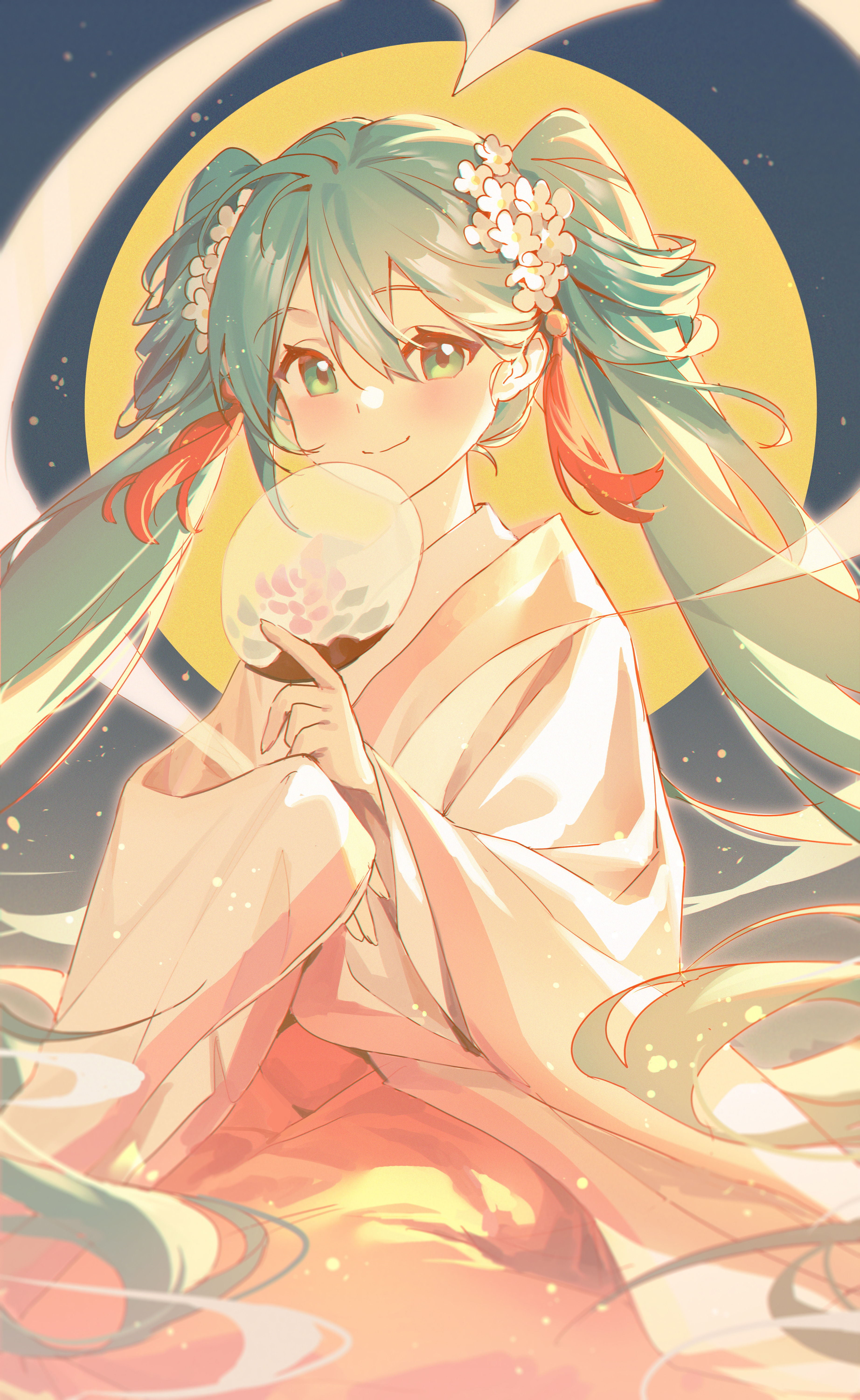 absurdres airseal alternate_costume blue_hair chuushuu_meigetsu_miku flower full_moon hair_flower hair_ornament hand_fan hatsune_miku highres holding holding_fan japanese_clothes kimono long_hair looking_at_viewer moon paper_fan tassel tassel_hair_ornament tuanshan twintails vocaloid white_kimono