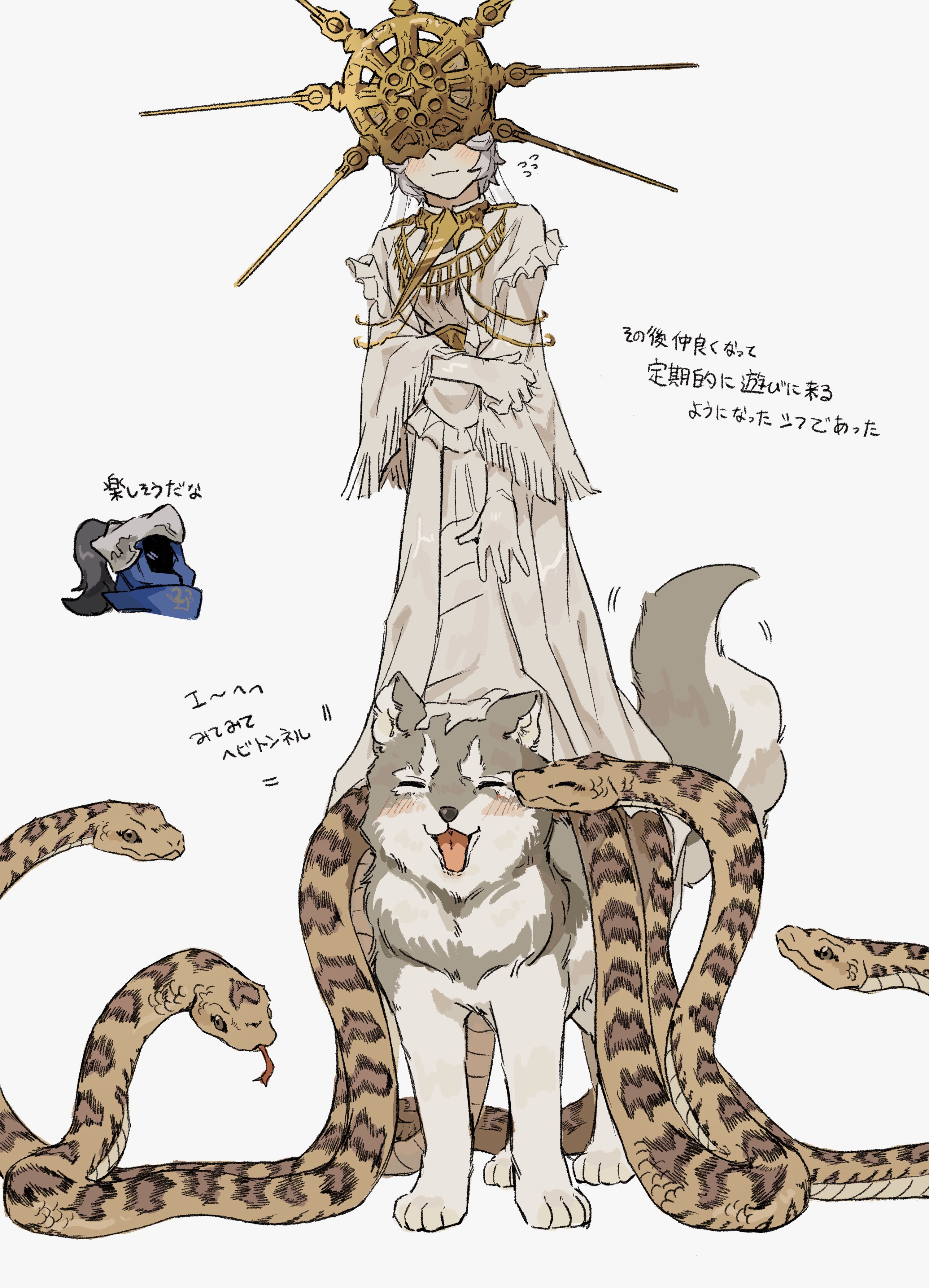 2boys :d absurdres animal artorias_the_abysswalker blush closed_mouth dark_souls_(series) dark_souls_i dark_sun_gwyndolin dress facing_viewer flying_sweatdrops full_body gloves gold_headwear great_grey_wolf_sif grey_dress grey_gloves helm helmet highres male_focus multiple_boys open_mouth plume simple_background smile snake tongue tongue_out translation_request trap white_background wolf zunkome