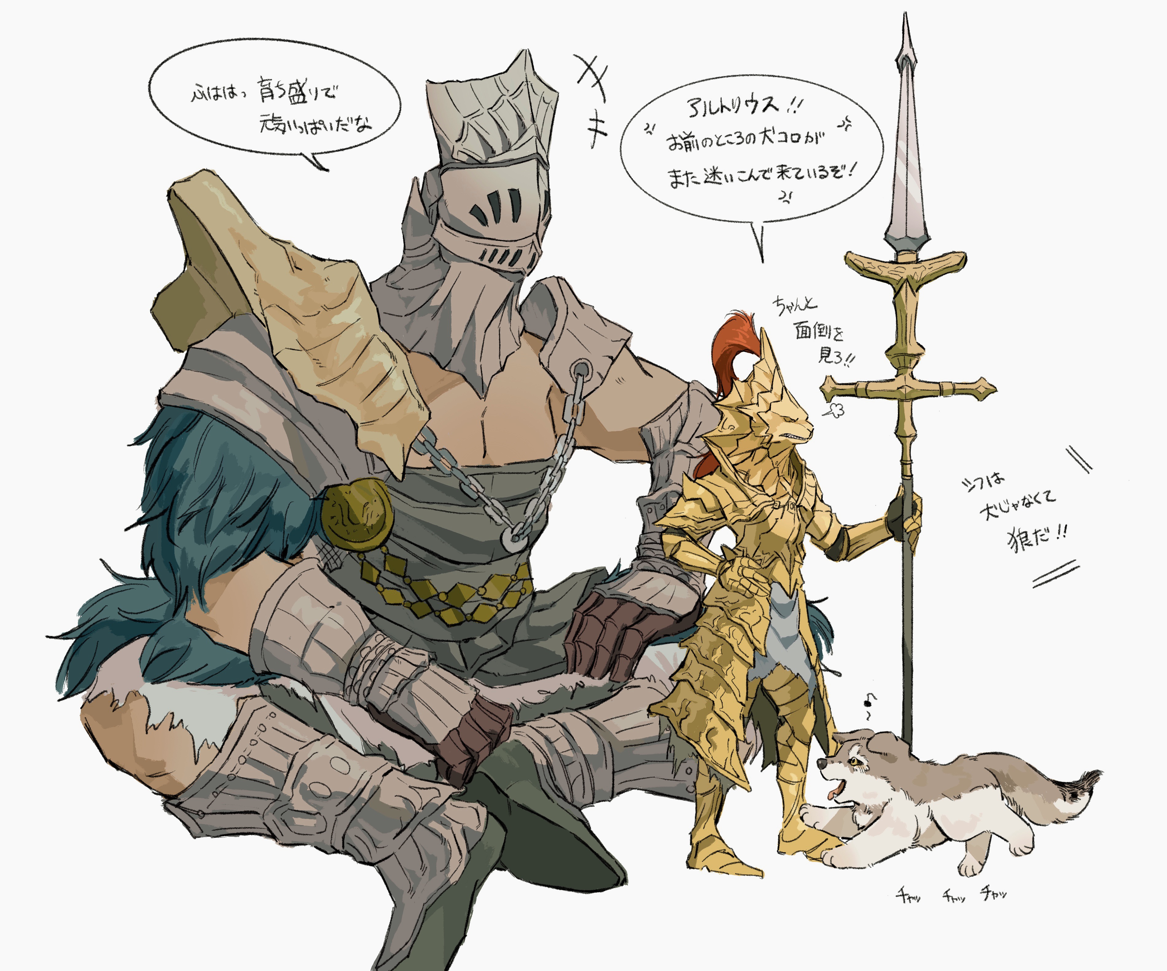 2boys absurdres aged_down angry animal armor black_gloves breastplate dark_souls_(series) dark_souls_i dragon_slayer_ornstein full_armor full_body gauntlets giant gloves gold_armor gold_headwear great_grey_wolf_sif hawkeye_gough helm helmet highres holding holding_polearm holding_weapon knight male_focus multiple_boys musical_note pauldrons plume polearm shoulder_armor shoulder_plates simple_background sitting spear speech_bubble standing translation_request weapon white_background wolf zunkome