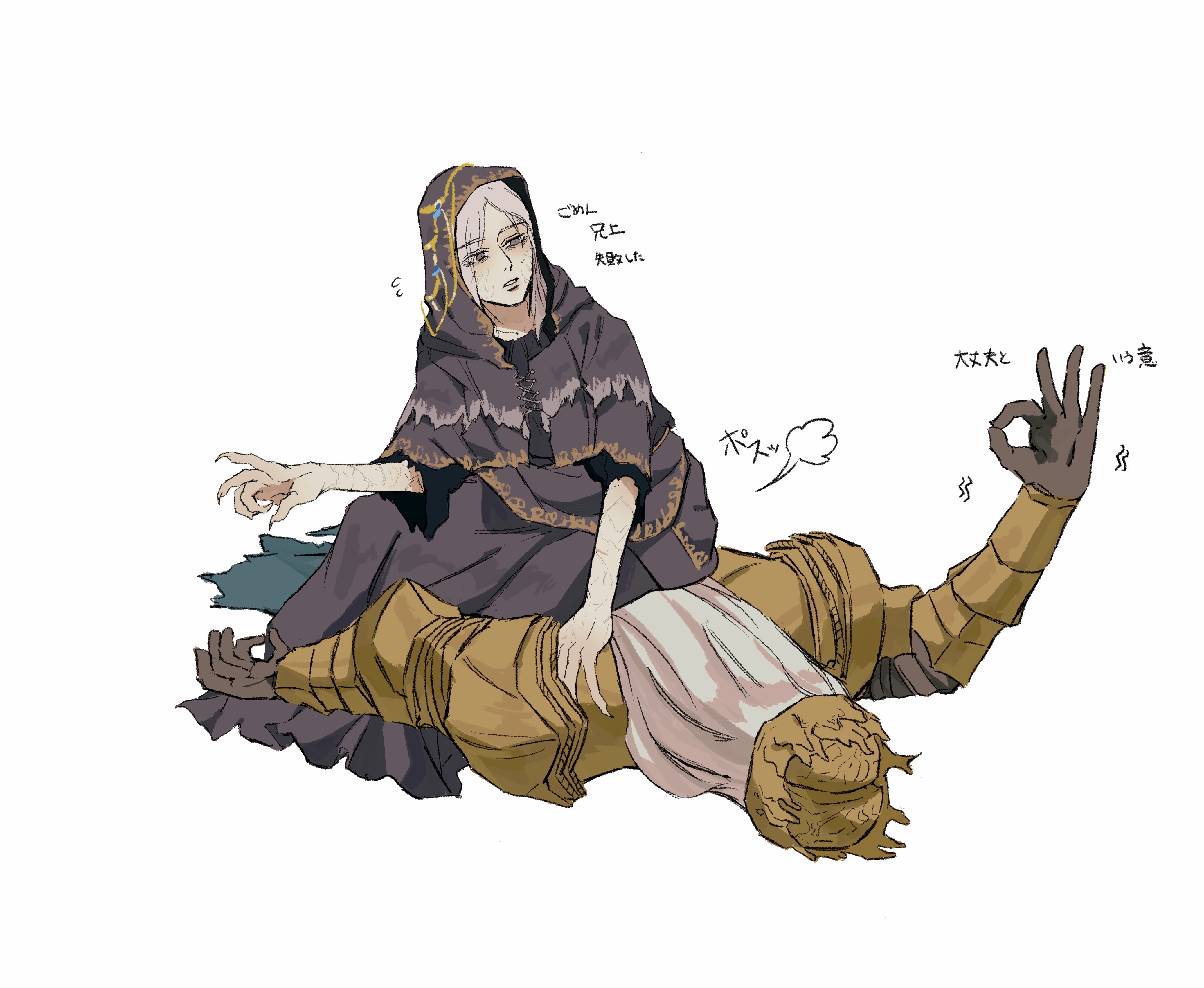2boys absurdres armor black_robe breastplate brothers dark_souls_(series) dark_souls_iii fingernails gold_armor gold_headwear grey_hair helmet highres hood hood_up hooded_robe long_hair looking_at_another lorian_(elder_prince) lothric_(younger_prince) lying male_focus multiple_boys ok_sign on_stomach robe scar scar_on_arm sharp_fingernails short_hair short_sleeves siblings sitting sitting_on_person translation_request trap vambraces zunkome