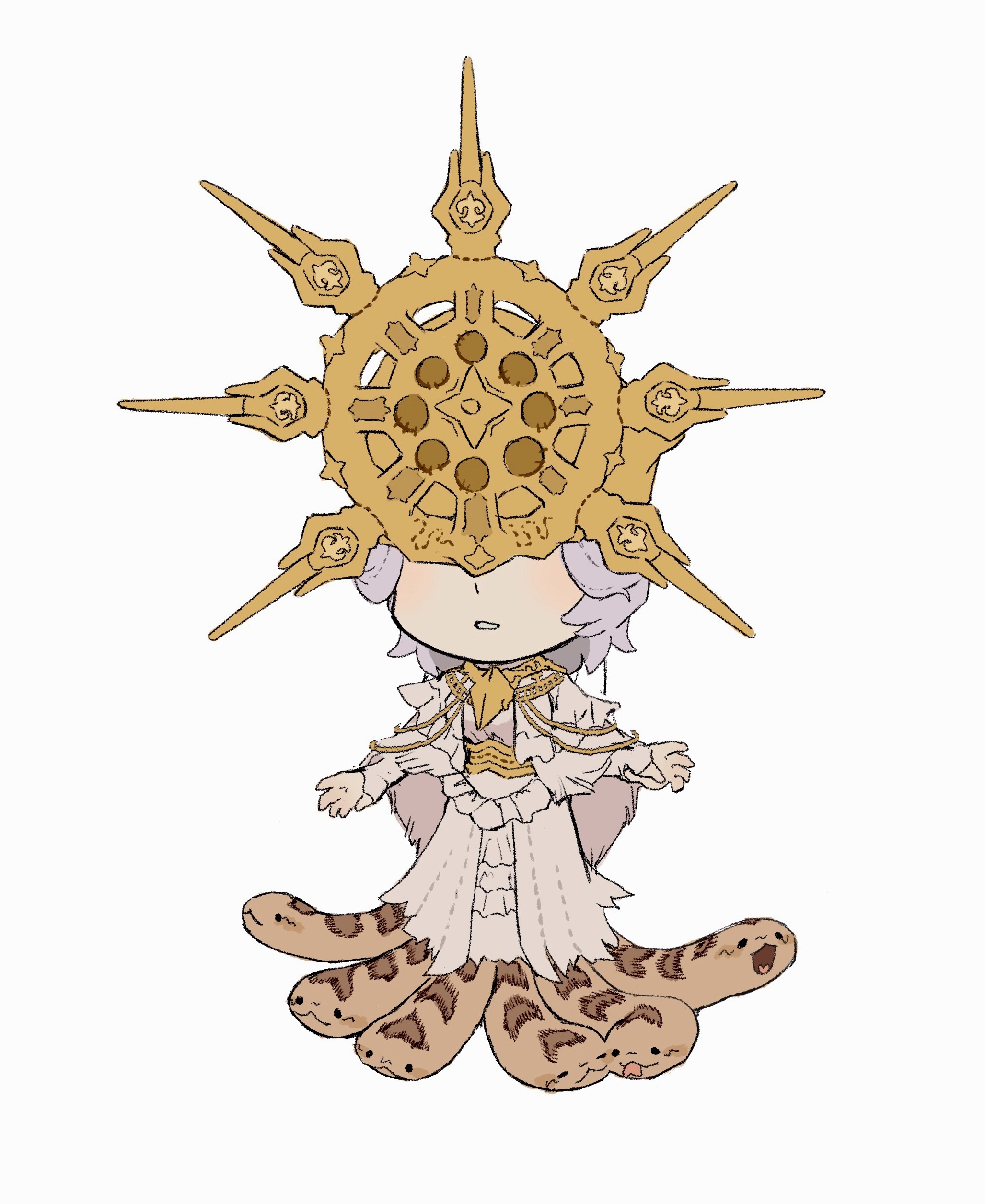 1boy :d absurdres animal chibi dark_souls_(series) dark_souls_i dark_sun_gwyndolin dress facing_viewer full_body gold_headwear grey_dress grey_hair greyscale helmet highres layered_dress long_sleeves male_focus monochrome open_mouth short_hair simple_background smile snake solo standing teeth torn_clothes torn_dress trap zunkome