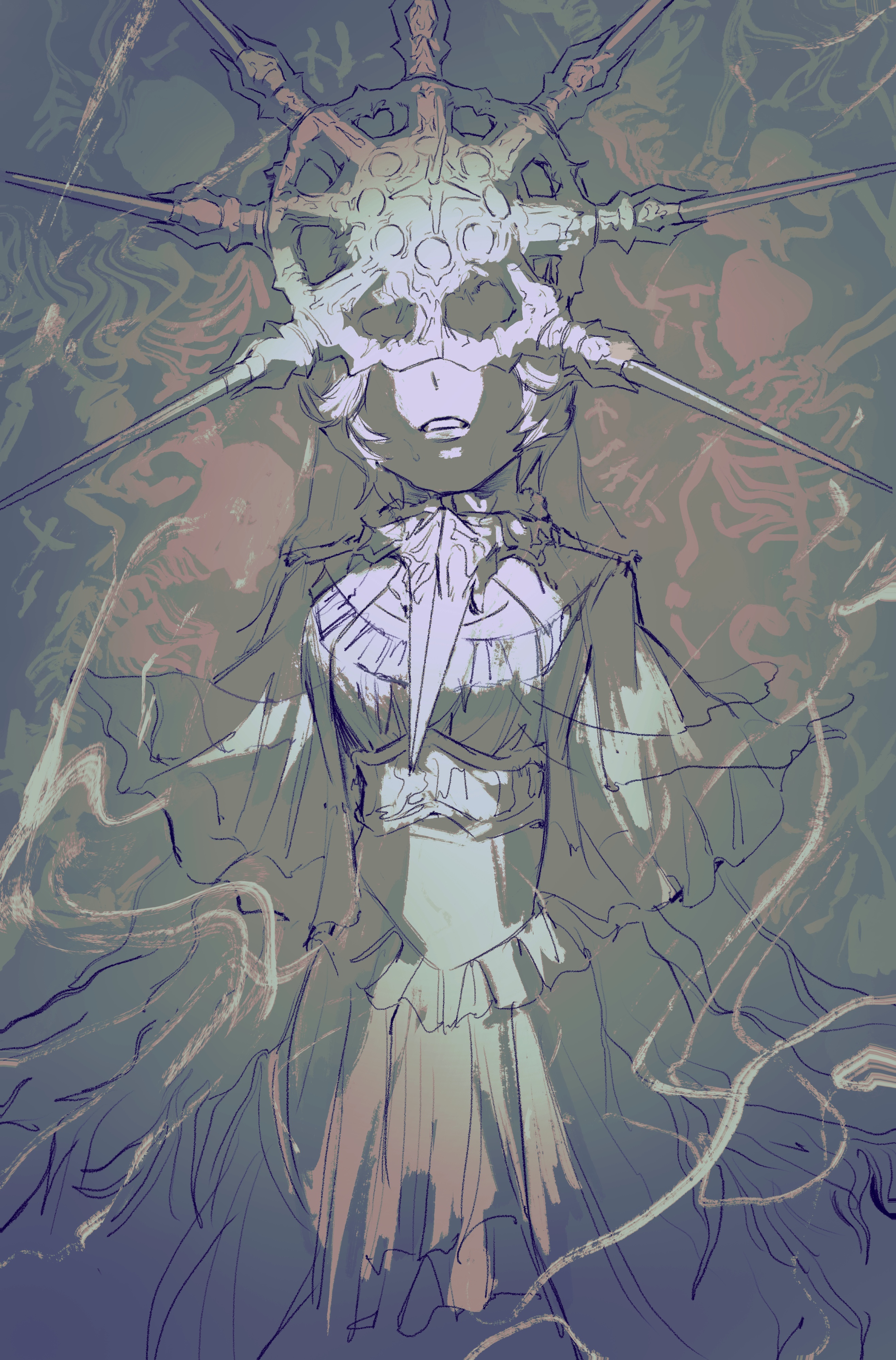 1boy absurdres breasts cowboy_shot crossdressing crossdressing_(mtf) dark_souls_(series) dark_souls_i dark_sun_gwyndolin dress facing_viewer frilled_dress frills helmet highres jewelry layered_dress male_focus male_with_breasts medium_breasts necklace parted_lips short_hair solo spiked_helmet spiked_necklace teeth trap zunkome