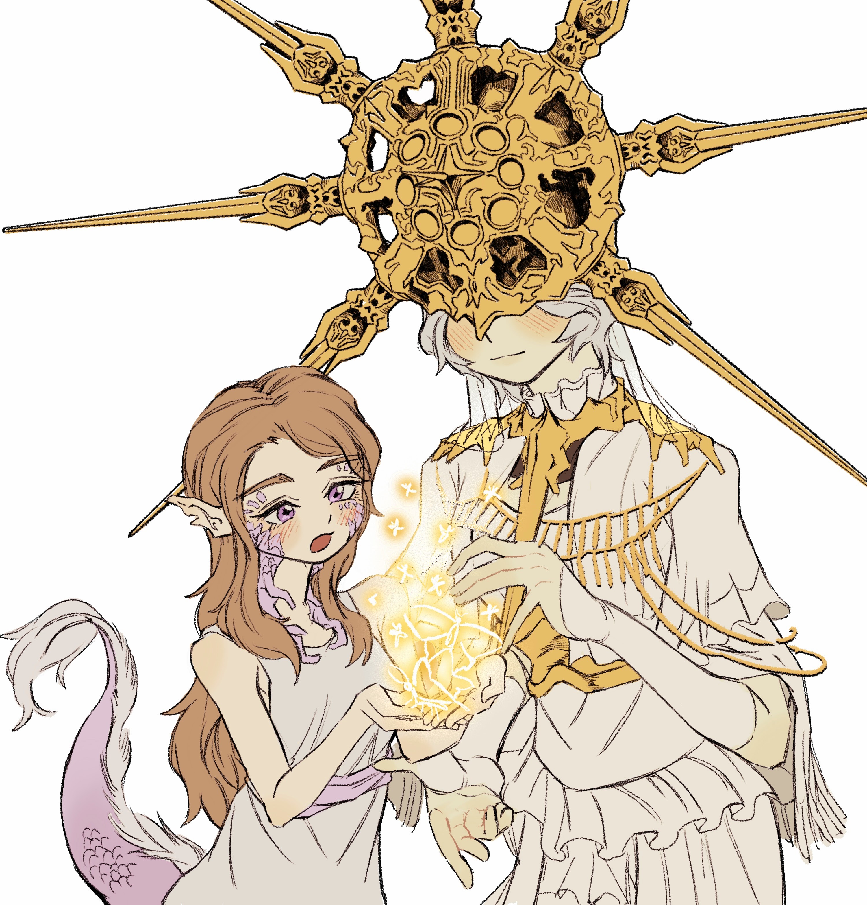 1boy 1girl :o absurdres blush brother_and_sister brown_hair company_captain_yorshka covered_eyes dark_souls_(series) dark_souls_i dark_souls_iii dark_sun_gwyndolin dragon_girl dress glowing gold_headwear helmet helmet_over_eyes highres long_hair pointy_ears robe scales siblings smile snake sun_symbol tail translation_request trap white_hair white_robe zunkome