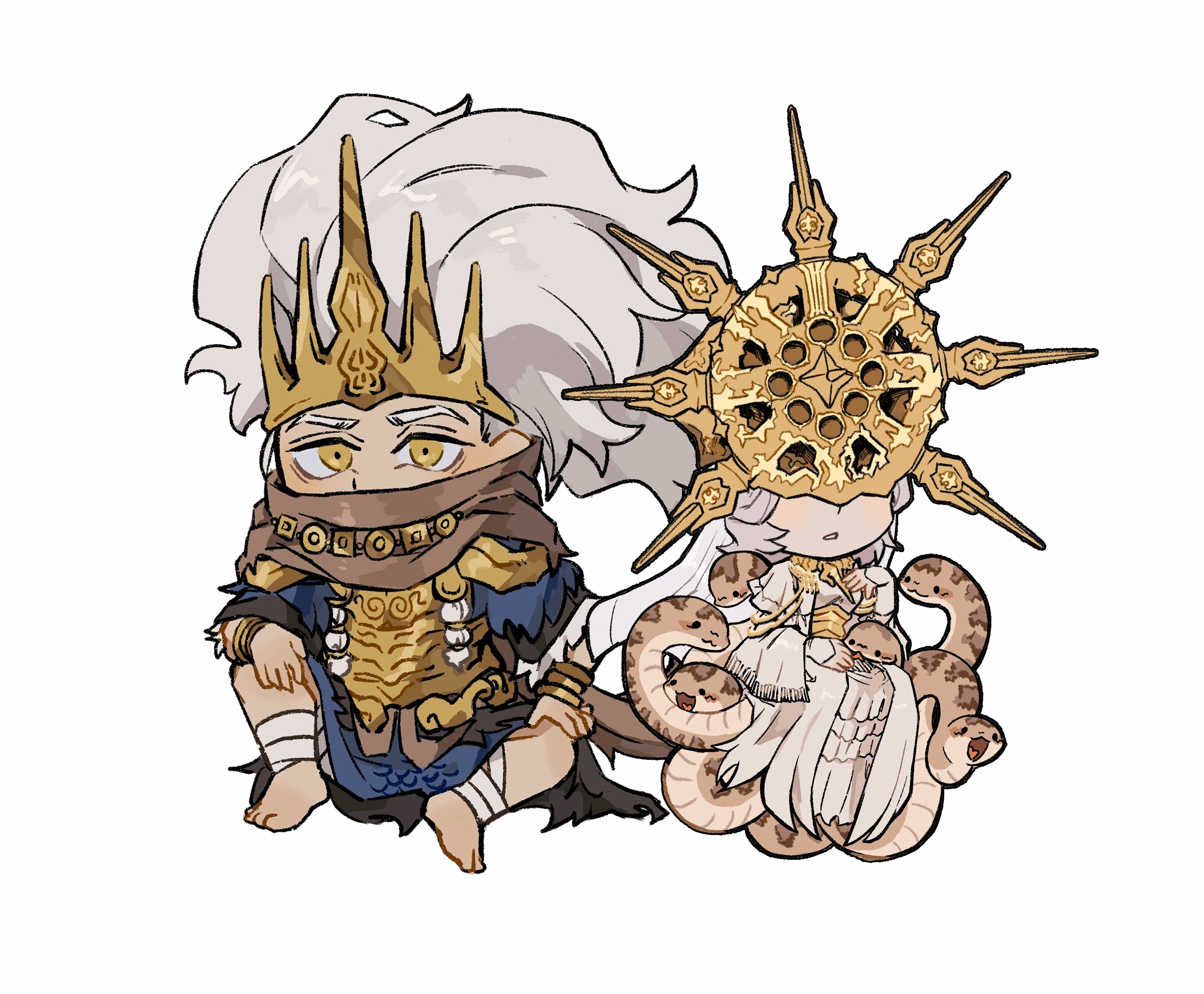 2boys :3 animal armor breastplate brothers brown_scarf chibi crown dark_souls_(series) dark_souls_i dark_souls_iii dark_sun_gwyndolin grey_hair hand_on_own_knee hand_up helmet highres knee_up long_hair long_sleeves male_focus multiple_boys nameless_king orange_eyes scarf short_hair siblings simple_background smile snake white_background zunkome