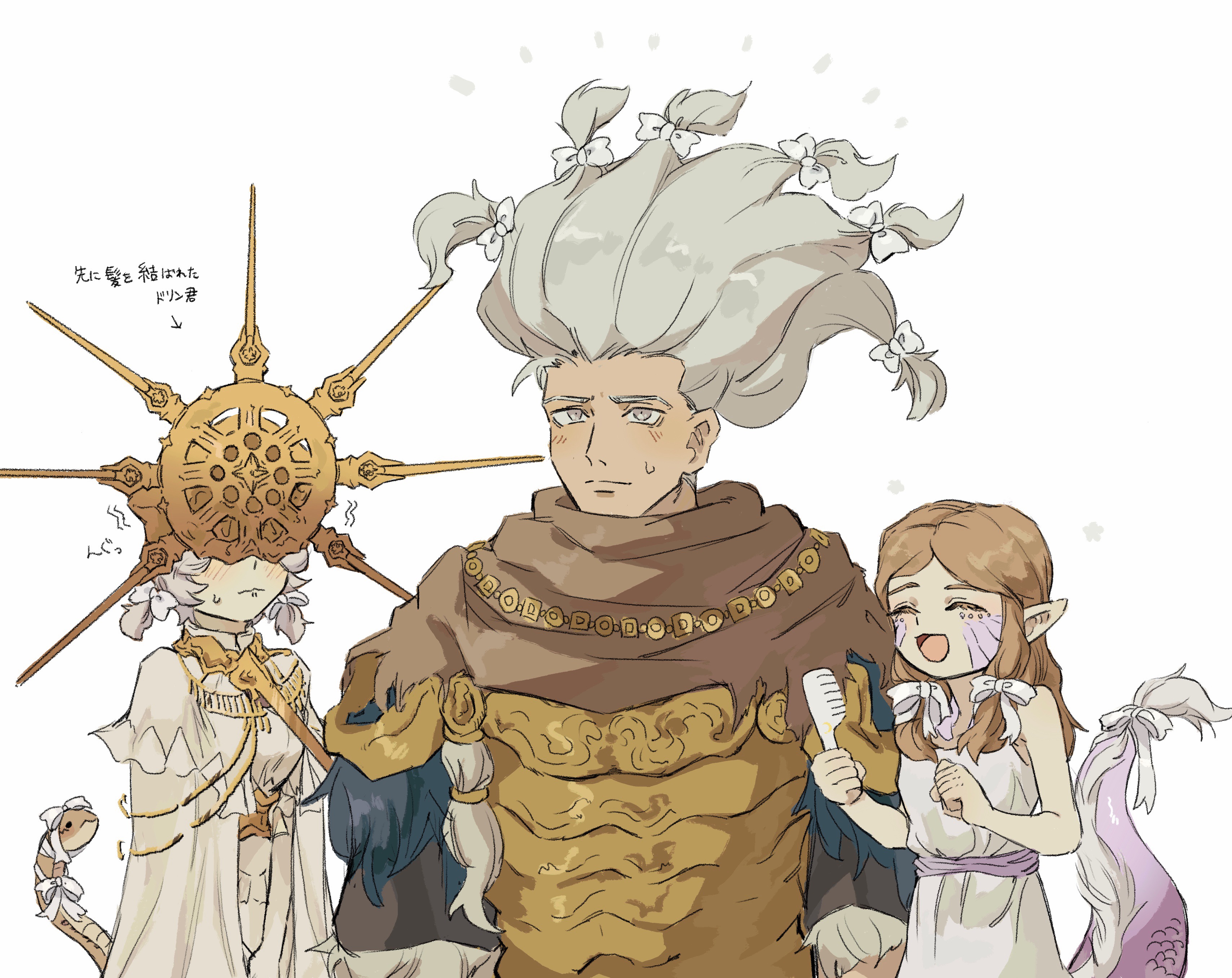 1girl 2boys :d absurdres alternate_hairstyle animal armor blush bow brother_and_sister brothers brown_hair brown_scarf closed_mouth comb company_captain_yorshka dark_souls_(series) dark_souls_i dark_sun_gwyndolin dragon_girl dragon_tail dress gold_armor gold_headwear grey_dress grey_eyes grey_hair hair_bow happy highres holding holding_comb long_hair looking_at_viewer multiple_boys multiple_hair_bows nameless_king notice_lines open_mouth pointy_ears scarf siblings simple_background smile snake sweatdrop tail translation_request white_background white_bow zunkome