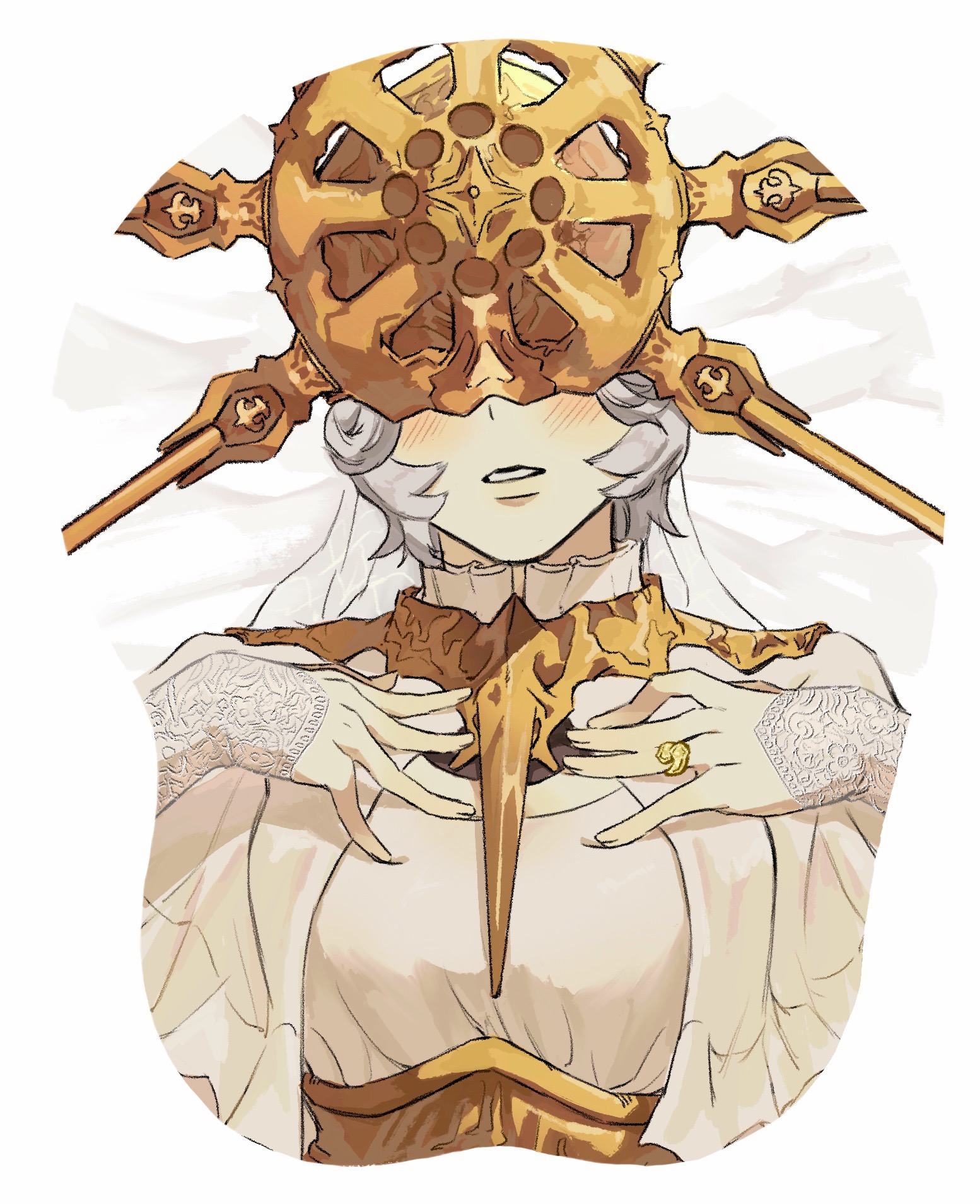 1boy armor blush breasts crossdressing crossdressing_(mtf) dark_souls_(series) dark_souls_i dark_sun_gwyndolin dress facing_viewer gold_armor gold_headwear gold_necklace grey_dress grey_hair grey_sleeves highres jewelry long_sleeves lying male_with_breasts mousepad_(medium) necklace on_back ring short_hair solo spiked_helmet spiked_necklace teeth trap upper_body zunkome