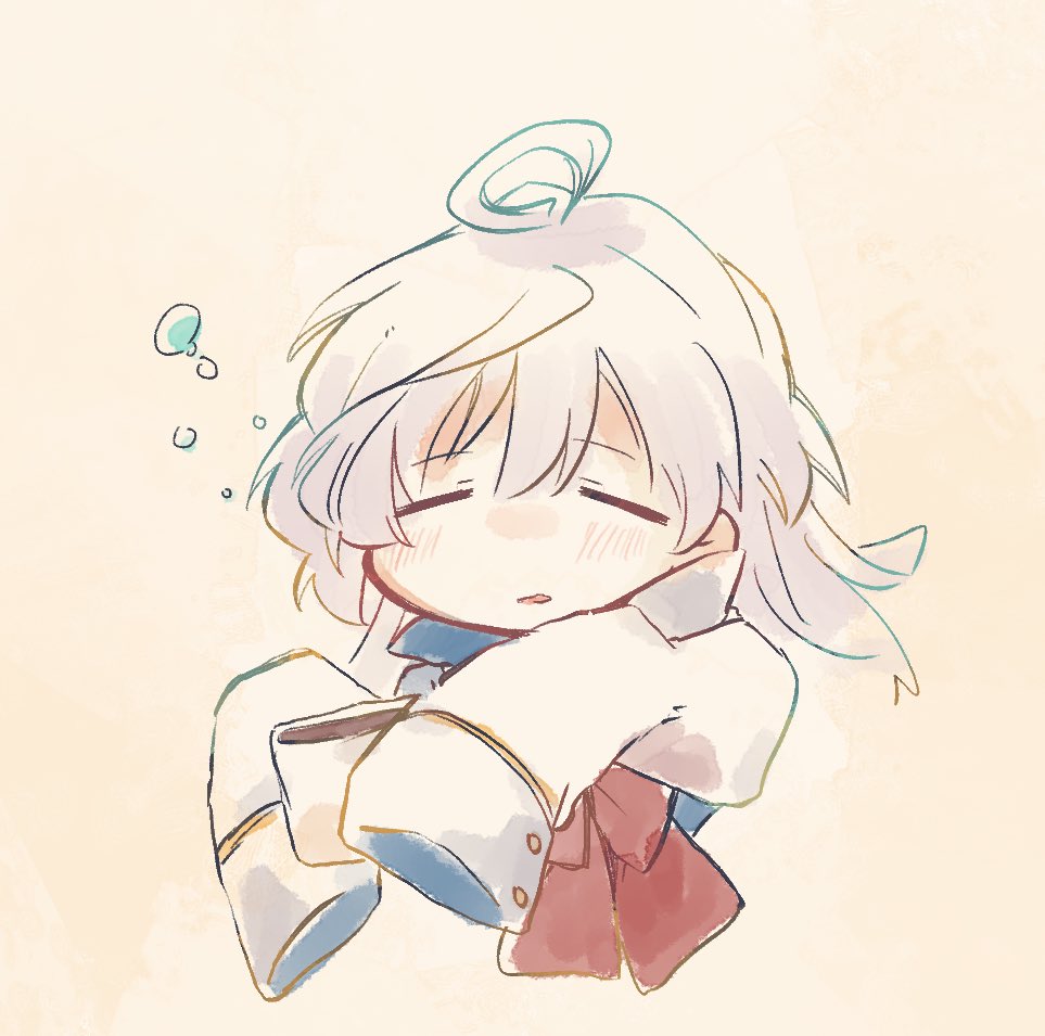 1girl =_= ahoge assault_lily blush bow bowtie brown_background closed_eyes coffee commentary_request cropped_torso cup facing_viewer gradient_background grey_hair hair_between_eyes hands_up herensuge_girls_academy_school_uniform holding holding_cup jacket long_hair long_sleeves parted_lips red_bow red_bowtie sasaki_ran school_uniform squeans sleepy sleeves_past_fingers sleeves_past_wrists solo toyo_(sameden46) upper_body white_jacket