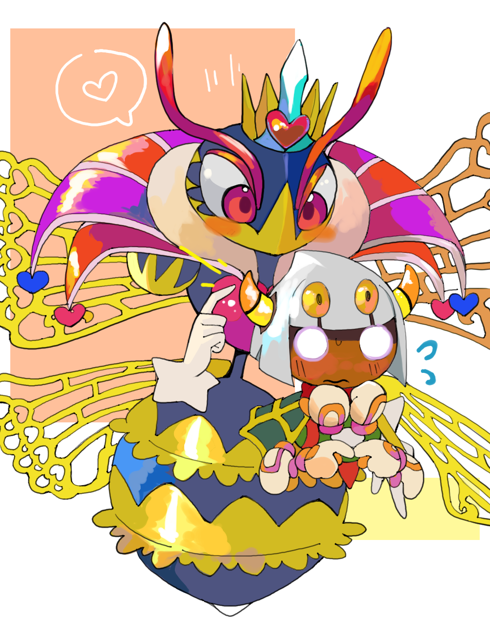 1boy 1girl antennae blush cape commentary_request disembodied_hand flying_sweatdrops gloves hakaba_(ksni_tbn) heart highres horns insect_wings kirby:_triple_deluxe kirby_(series) nintendo no_humans pink_eyes queen_sectonia rayman_limbs taranza white_gloves white_hair wings