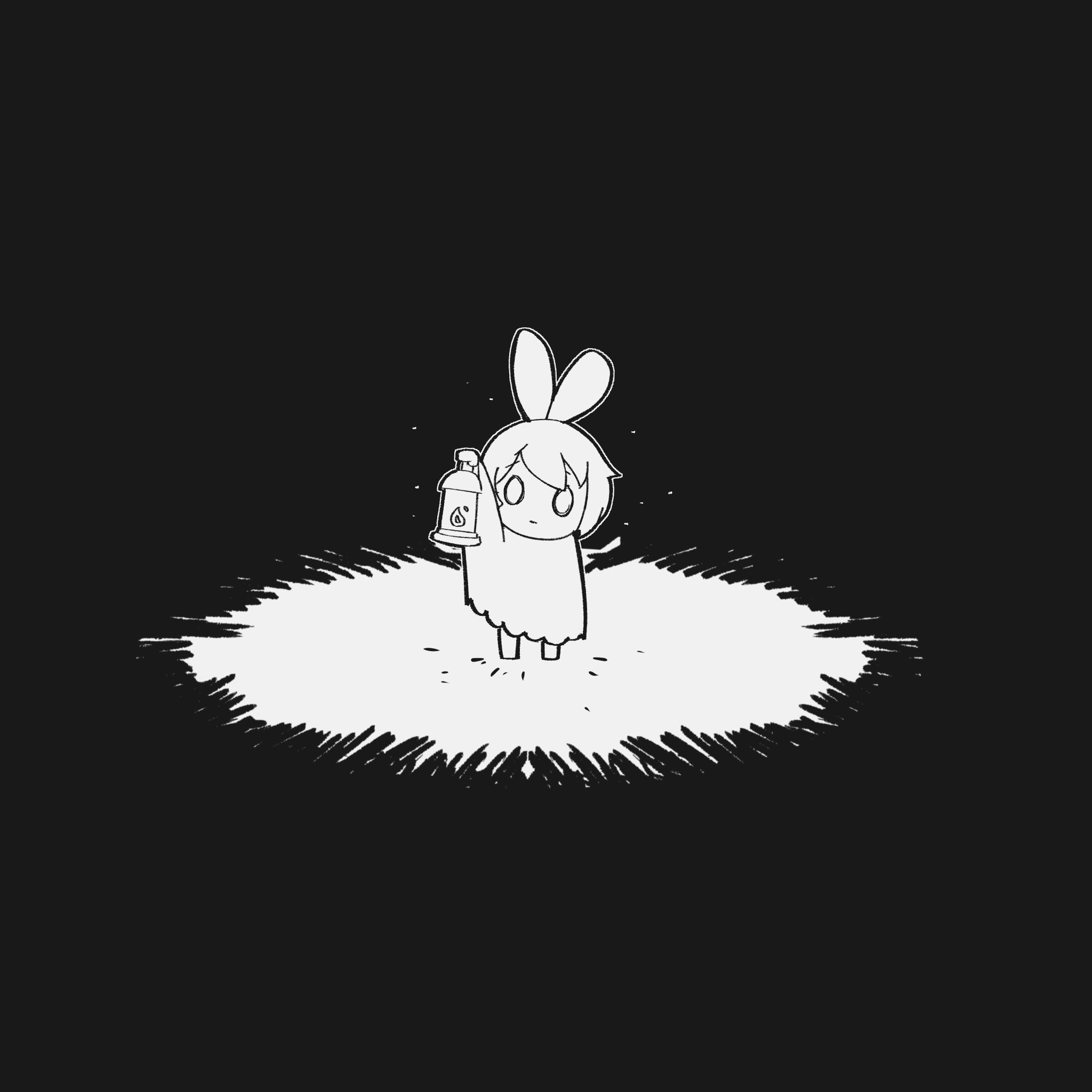 1girl black_background cloak feathers full_body highres holding holding_lantern hololive hololive_english lantern light monochrome mumei_(hololive) mumei_(song)_(hololive) nanashi_mumei saruissaart short_hair solo standing virtual_youtuber