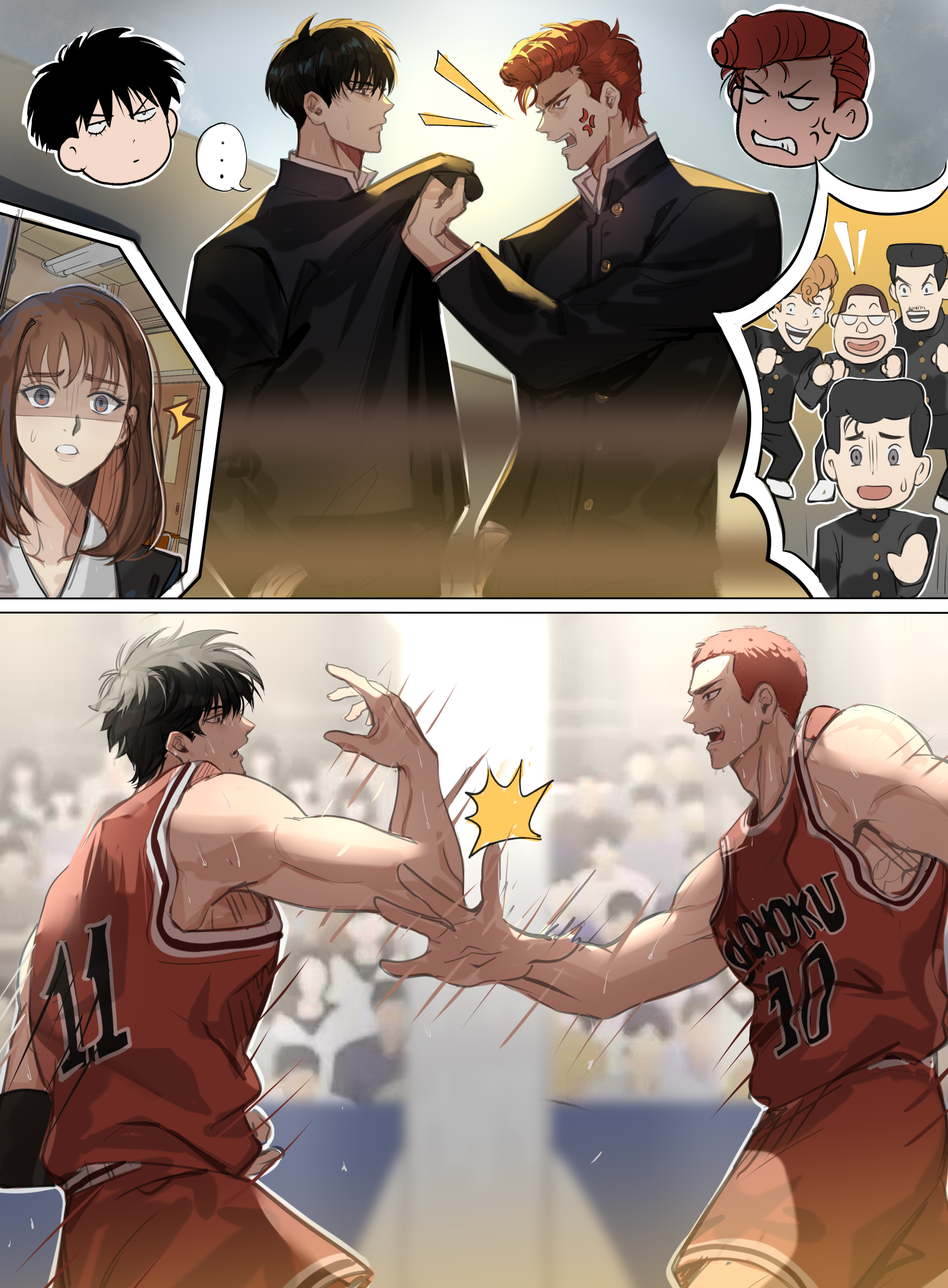 1girl 6+boys absurdres akagi_haruko anger_vein basketball_court basketball_uniform black_hair brown_hair chibi chibi_inset hand_up haze_(ha_ze) high_five highres medium_hair mito_youhei multiple_boys muscular muscular_male noma_chuuichirou ookusu_yuuji red_hair red_shirt red_shorts rukawa_kaede sakuragi_hanamichi scene_reference school_uniform shirt short_hair shorts slam_dunk_(series) sleeveless sleeveless_shirt smile speech_bubble sportswear takamiya_nozomi tank_top very_short_hair