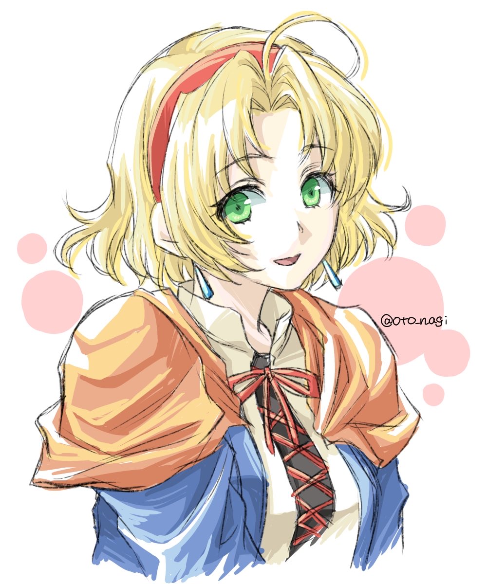 1girl blonde_hair cecilia_lynne_adelhyde earrings green_eyes hairband highres jewelry looking_at_viewer open_mouth oto_nagi red_hairband red_ribbon ribbon short_hair smile solo wild_arms wild_arms_1