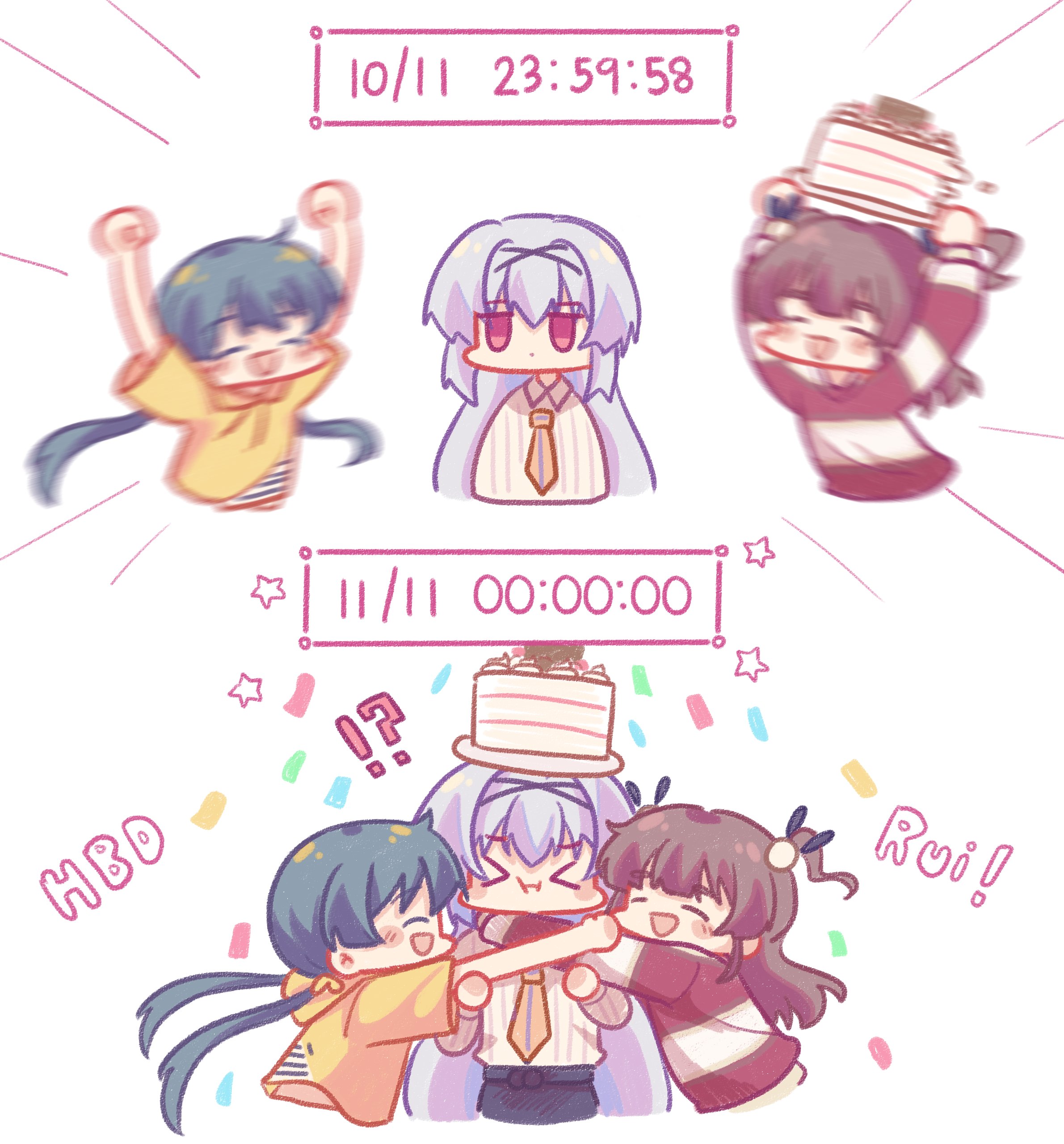 !? >_< 0_0 3girls :d :t absurdres arms_up black_skirt blank_eyes blush brown_hair cake chibi closed_eyes collared_shirt cropped_torso food green_hair hair_between_eyes hair_intakes happy_birthday high-waist_skirt highres holding holding_cake holding_food hood hood_down hoodie hug idoly_pride kabotd long_hair long_sleeves low_twintails motion_blur motion_lines multiple_girls necktie okuyama_sumire open_mouth orange_necktie pinstripe_pattern pinstripe_shirt red_shirt shirt shirt_tucked_in short_sleeves sidelocks skirt smile striped_clothes striped_shirt suzumura_yuu tendou_rui twintails two_side_up white_shirt yellow_hoodie