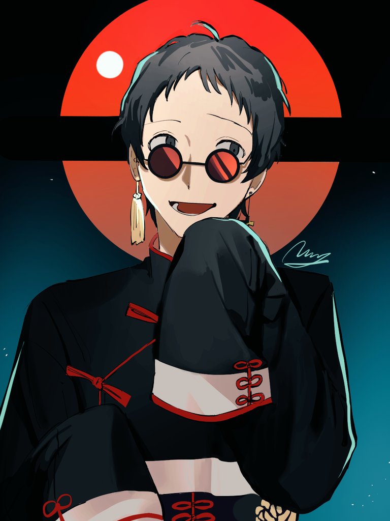 1boy adachi_tooru alternate_costume black-framed_eyewear black_eyes black_hair black_jacket chinese_clothes earrings glasses hand_up jacket jewelry long_sleeves looking_at_viewer male_focus momotamago open_mouth persona persona_4 round_eyewear short_hair sleeves_past_fingers sleeves_past_wrists smile solo tassel tassel_earrings upper_body