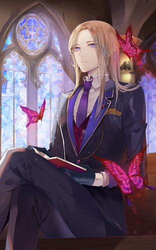 1boy black_gloves black_jacket black_pants black_suit book brown_hair bug bungou_to_alchemist butterfly church closed_mouth collared_shirt crossed_legs feet_out_of_frame formal_clothes fuyuomi gloves half_gloves holding holding_book indoors insect jacket lapel_pin lapels long_hair looking_at_viewer lowres male_focus mole mole_under_eye necktie notched_lapels official_art open_book pants parted_bangs pew pillar pocket_square purple_eyes purple_necktie reading red_butterfly red_vest shirt sitting solo stained_glass suit third-party_source vest white_shirt yumeno_kyuusaku_(bungou_to_alchemist)