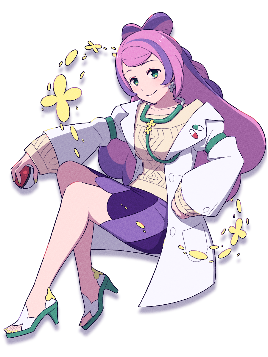 1girl coat collarbone commentary_request earrings full_body green_sandals hand_on_own_hip high_heel_sandals high_heels highres hinoyama_kou holding holding_poke_ball jewelry long_hair long_sleeves medium_skirt miriam_(pokemon) nail_polish nintendo open_clothes open_coat pink_hair poke_ball poke_ball_(basic) pokemon pokemon_scarlet_and_violet purple_skirt sandals skirt solo sweater toenail_polish toenails white_background white_coat yellow_nails yellow_sweater