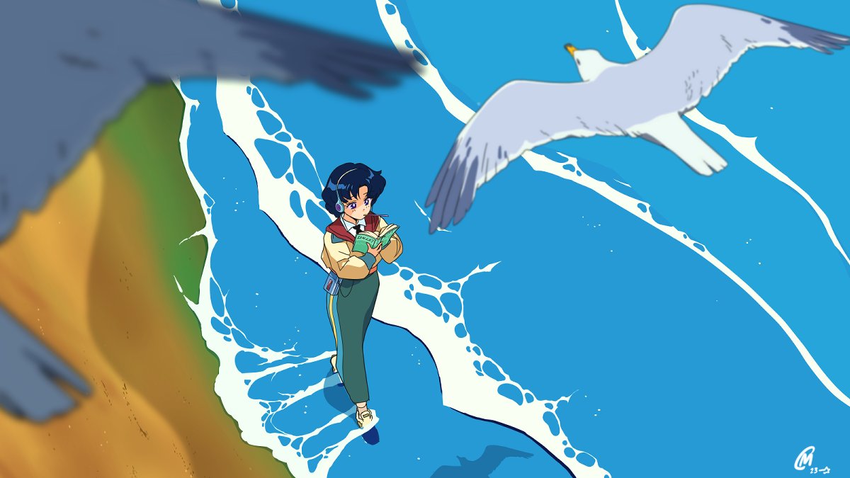1girl animal artist_logo beach bird blue_hair book brown_jacket commentary dated english_commentary from_above full_body headphones holding holding_book jacket logo matt_cummings outdoors reading seagull shirt short_hair solo walking water white_shirt