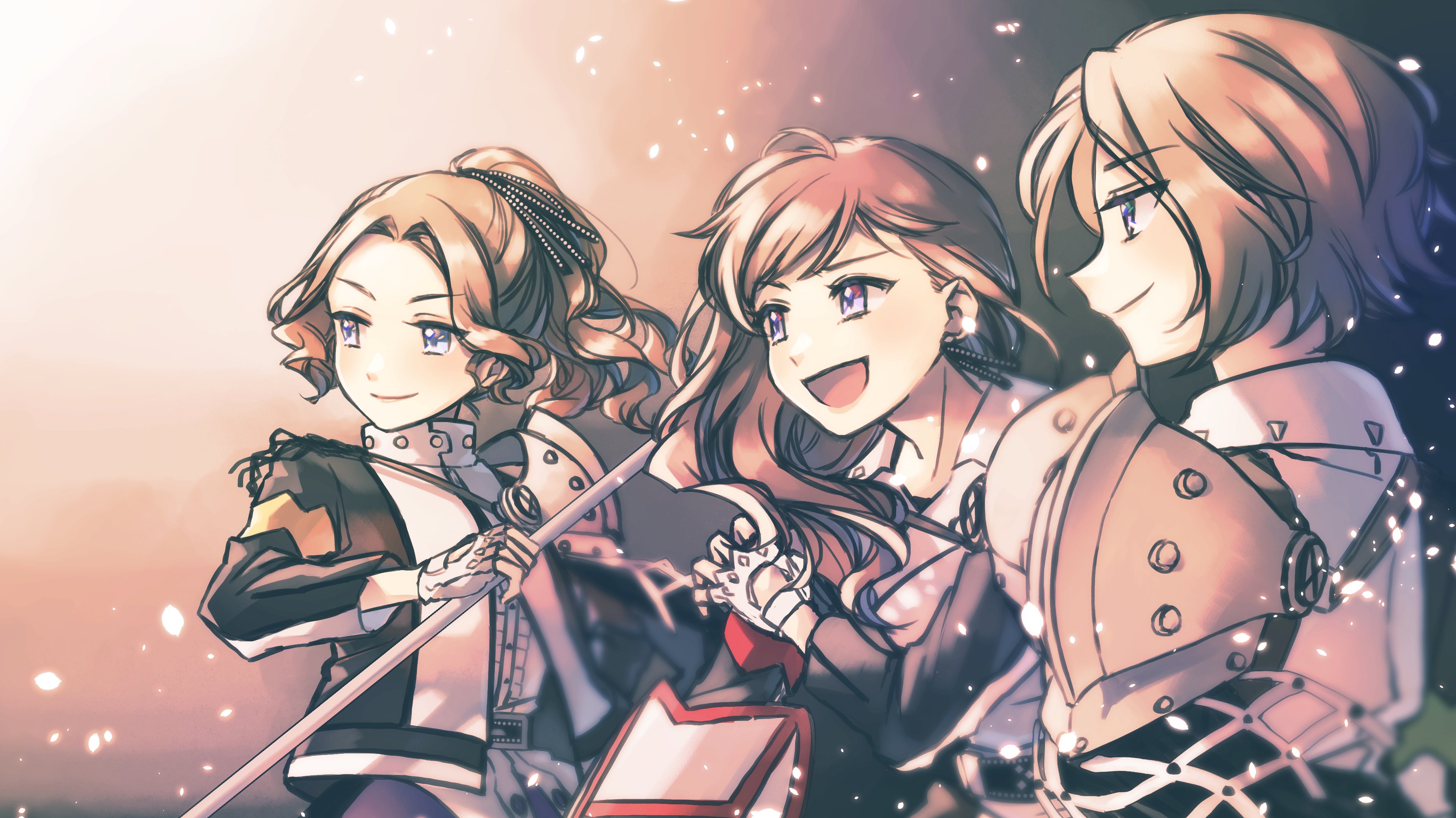 3girls :d absurdres arm_at_side belt belt_buckle black_background black_belt black_jacket black_ribbon blue_eyes blue_skirt blurry brown_background brown_hair buckle buttons center_frills closed_mouth depth_of_field earrings fingerless_gloves frilled_shirt frills gloves gradient_background hair_over_shoulder hair_ribbon hand_up high_ponytail highres holding holding_weapon honami_hisame jacket jewelry light_particles long_hair long_sleeves looking_ahead minase_suzu multicolored_jacket multiple_girls open_clothes open_jacket open_mouth parted_bangs ponytail profile purple_eyes ribbon shield shirt short_hair shoujo_kageki_revue_starlight single_shoulder_pad skirt smile standing tareko two-tone_jacket upper_body v-shaped_eyebrows wavy_hair weapon white_gloves white_jacket white_shirt yanagi_koharu