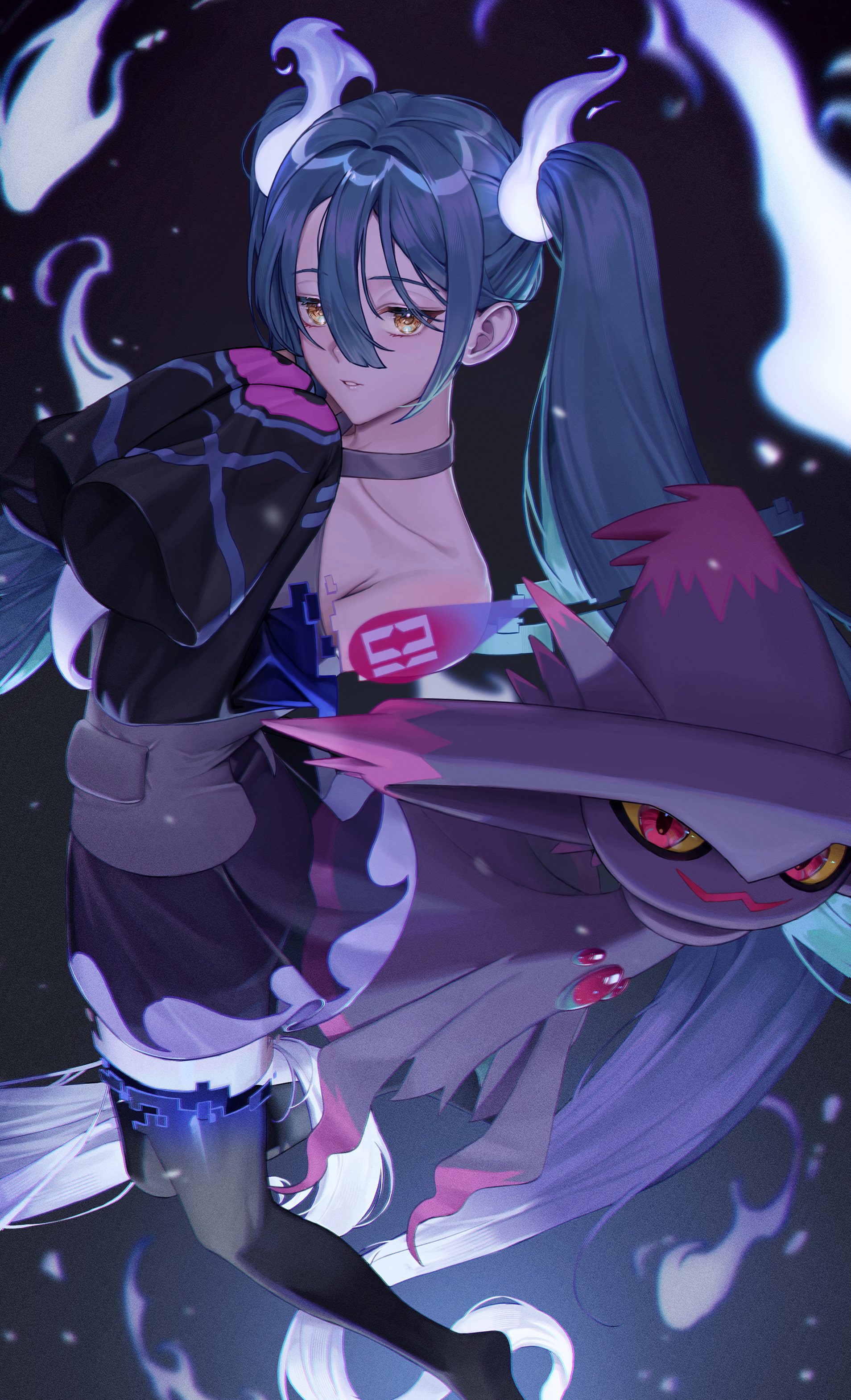 1girl absurdres aqua_hair black_thighhighs detached_sleeves gen_4_pokemon ghost ghost_miku_(project_voltage) glitch gradient_hair grey_shirt hair_between_eyes hatsune_miku highres l000ading long_hair looking_at_viewer mismagius multicolored_hair nintendo parted_lips pokemon pokemon_(creature) project_voltage see-through_clothes see-through_skirt shirt skirt thighhighs twintails very_long_hair vocaloid will-o'-the-wisp_(mythology) yellow_eyes