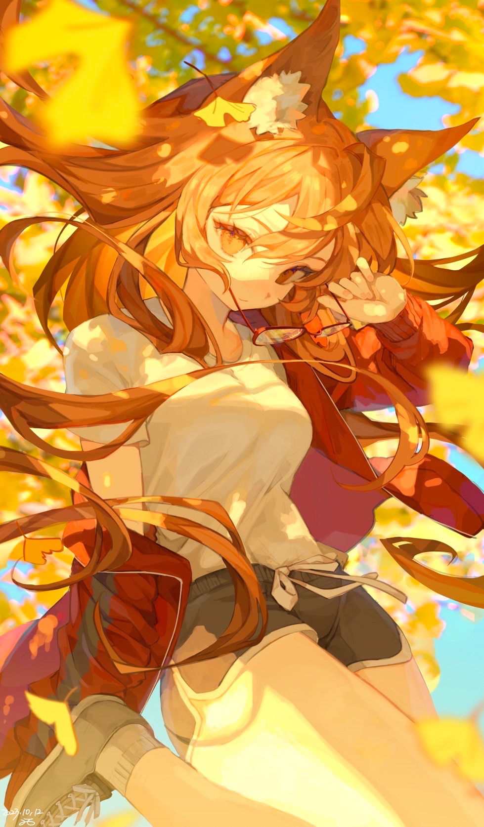 1girl animal_ear_fluff animal_ears ankle_socks autumn autumn_leaves black_shorts blue_sky closed_mouth commentary dated expressionless unworn_eyewear falling_leaves foot_out_of_frame foot_up fox_ears fox_girl grey_footwear grey_socks highres holding holding_removed_eyewear jacket leaf long_hair long_sleeves looking_at_viewer ofgwr open_clothes open_jacket orange_eyes orange_hair original outdoors red-framed_eyewear red_jacket removing_eyewear shirt shorts signature sky socks solo untranslatable_commentary t-shirt unworn_eyewear very_long_hair white_shirt